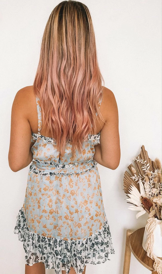 Our Jessa Dress comes in a light powdery blue base with contrasting light tan and white and navy blue toned floral print in a relaxed fit. This mini features frill detailing across the v neckline, elasticated waist and layered skirt whilst the fabric waist tie gives this piece a wrap look. Pair with sandals and a sun hat for an effortless brunch date outfit.