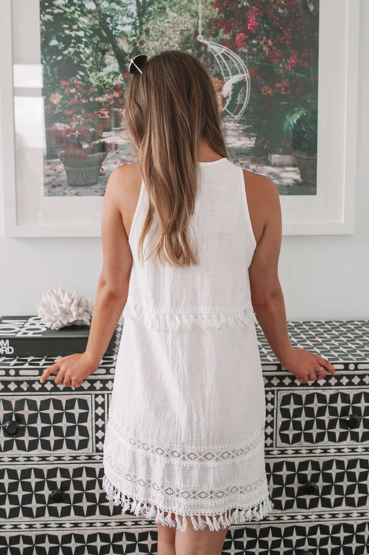 Our Ariana Dress comes in a classic fresh white tone in a relaxed fit. This summery mini features tassel detailing across the bodice and hemline, complemented by the crochet lace detailing on the skirt. Pair with a sunhat and tan sandals for an effortless summer’s day look.