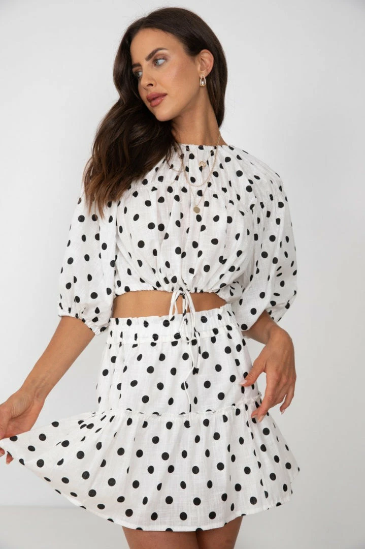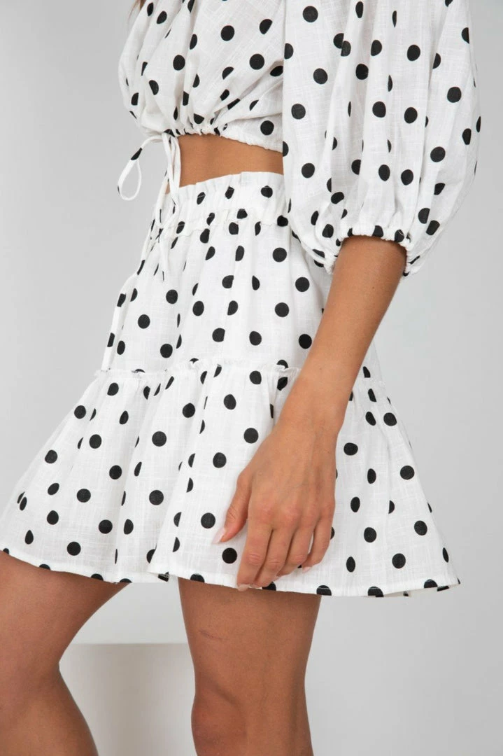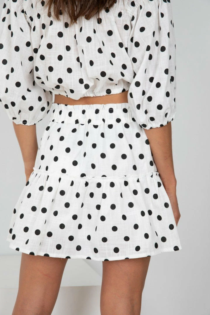 Our Kimberley Skirt comes in a white tone base, with a black tone spot print. It features a mini-length & elasticated waistband for a relaxed, comfortable fit. Pair this skirt with our Kimberley Top to complete the look!