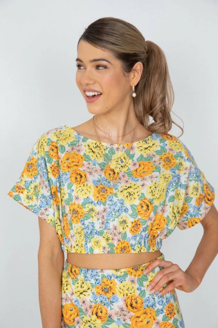 Our Loreta Top comes in a fabulous floral print. This crop features short sleeves, an elastic hem to cinch the waist, and a boat neckline. Complete the look with our Loreta skirt, sandals, and gold accessories for the perfect off-duty look!.