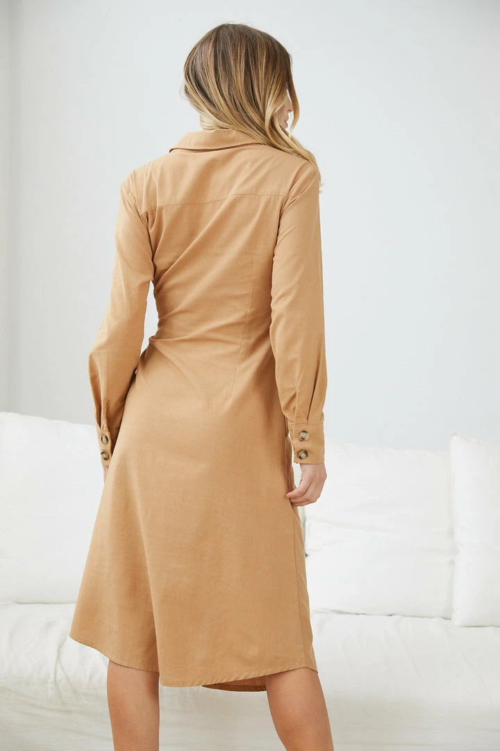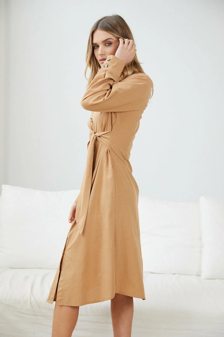 Our Eisley Dress comes in a classy camel brown colour. Experiment your way in the style lab with this midi that features a classic collar, centre-front buttons, long sleeves with cuffs and a side fabric tie to cinch in the waist. Captivate the crowd by matching this with a trendy leather hand bag and gold accessories!