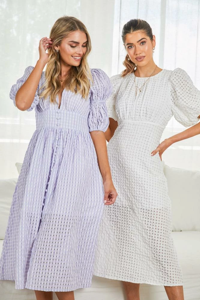 - Key Features: Midi Length. Round neckline. Short puff sleeves. Elasticated bodice. Flowy skirt.