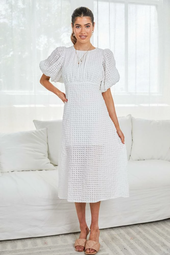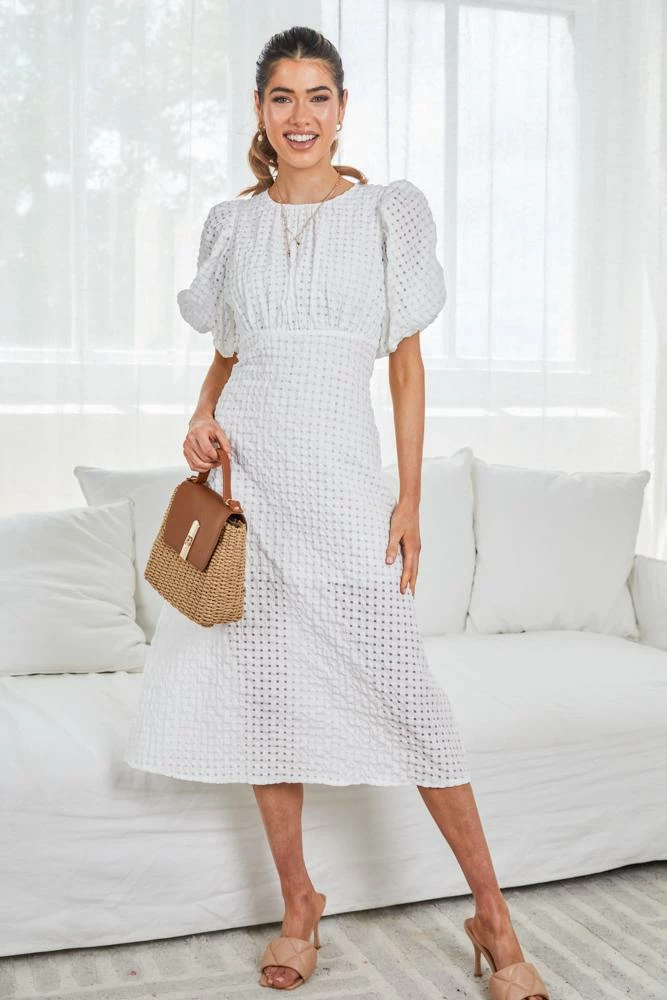 Our Ramosa Dress is classic white tone. This features a midi-length skirt, a high round neckline, a hidden zipper at the back, and beautiful puff short sleeves with tie details. Pair with your favourite heels and accessories, you’re sure to draw every eye in the room.