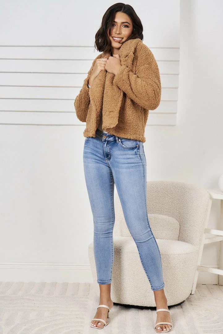Our Gillian Jacket comes in a dark tan tone. It features oversized lapels, long relaxed sleeves and buttons on the front to close. This warm teddy jacket is the perfect outer layer for the cold winter months!