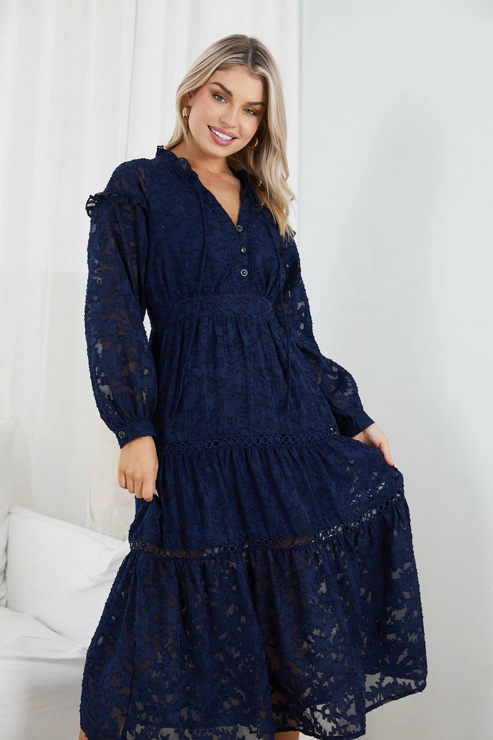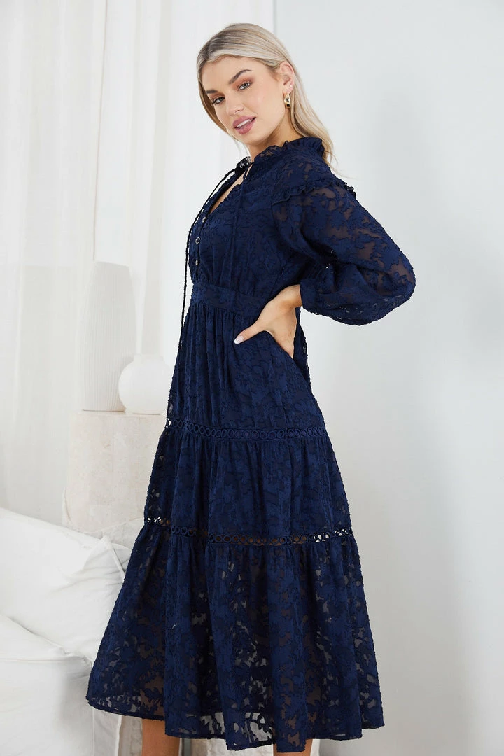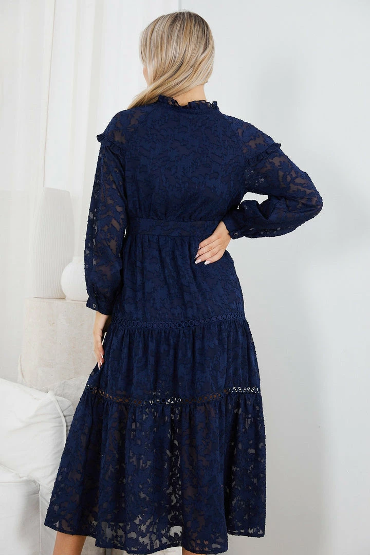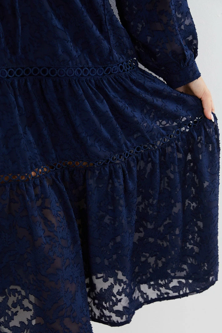 Our Meghan Dress comes in a navy blue color. This jacquard chiffon dress is the perfect elevating style for winter. Designed in a silhouette that cinches in at the waist, with sheer sleeves, it will look chic with heels and statement earrings.