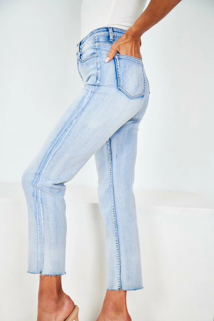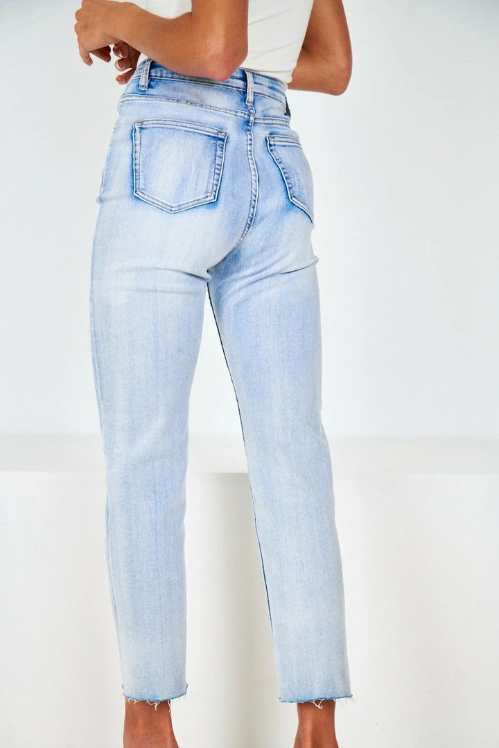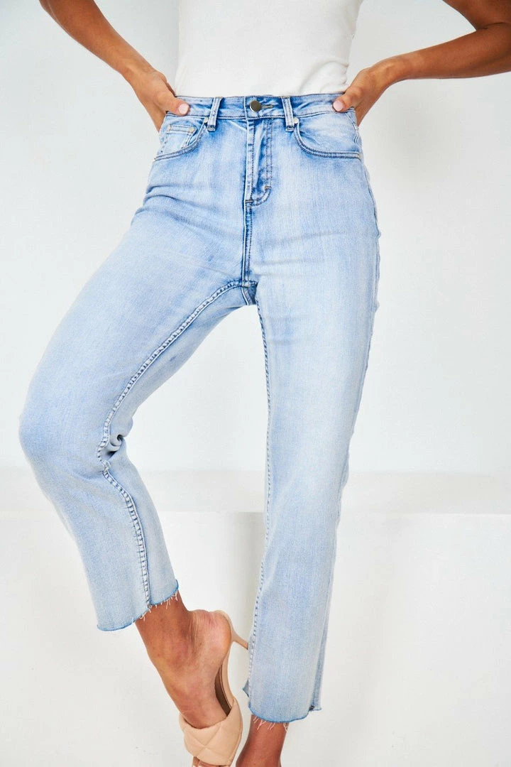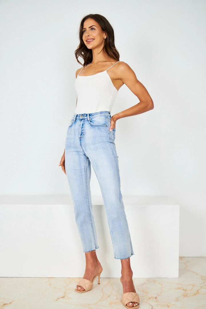 Our Aceline Jeans come in a light blue tone. The high waist, medium weight non-stretch fabric, with a slim leg fit is a classic model that will give a gorgeous line to your shape. With pockets on the front side and back, it is a must-have for any wardrobe and easily matches with so many styles.