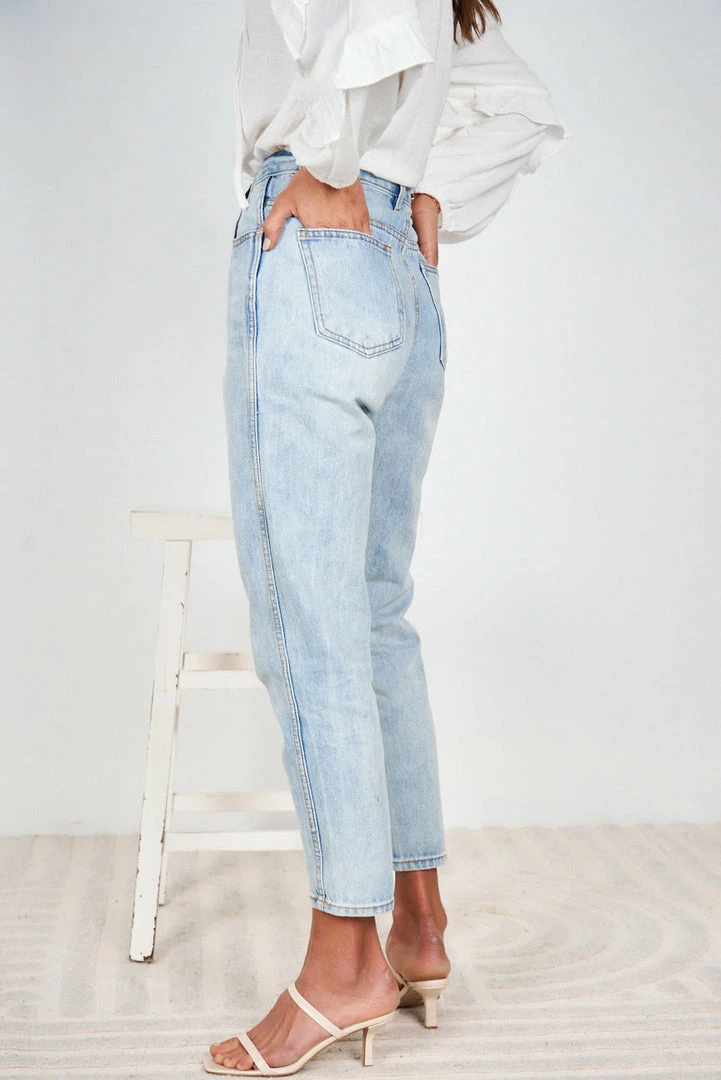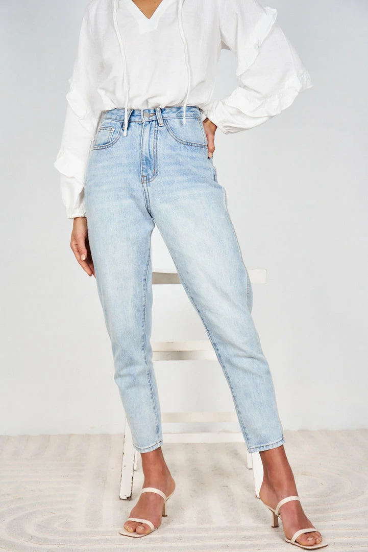 Our Lainey Jeans come in a light blue tone. The high waist, medium weight non-stretch fabric, with a slim leg fit is a classic model that will give a gorgeous line to your shape. With pockets on the front side and back, it is a must have for any wardrobe as it easily matches with so many styles.
