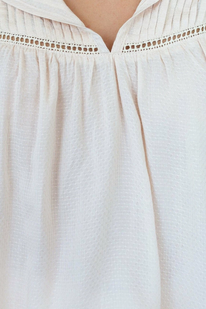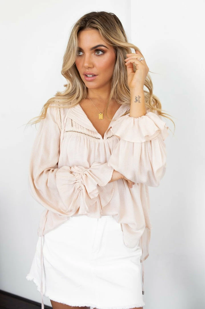 Our Emma Top comes in a lovely neutral light beige tone. The V neckline with tie detailing, ladder lace detailing across the chest, and cinched sleeves with frill detailing are stunning additions to this piece. This blouse can be easily dressed up for everyday wear or even for the office.