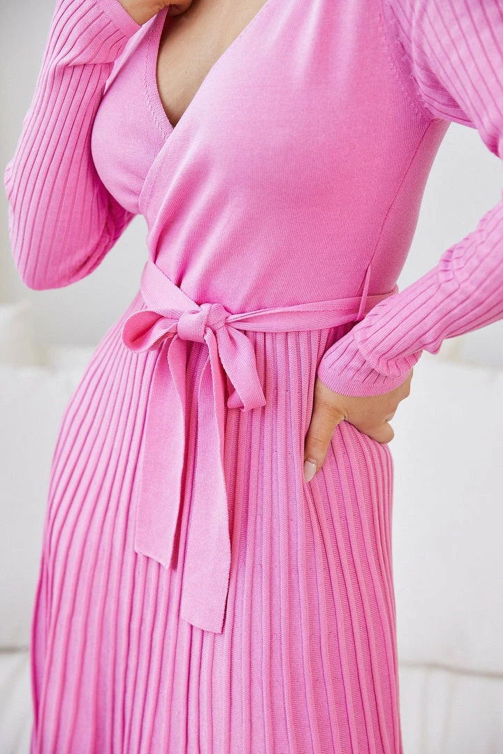 - Key Features: V neckline. Long sleeves. Pleated skirt. Fabric waist tie. Comfortable.