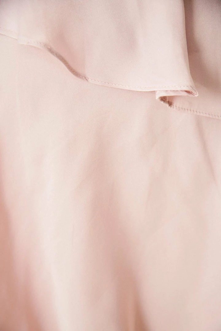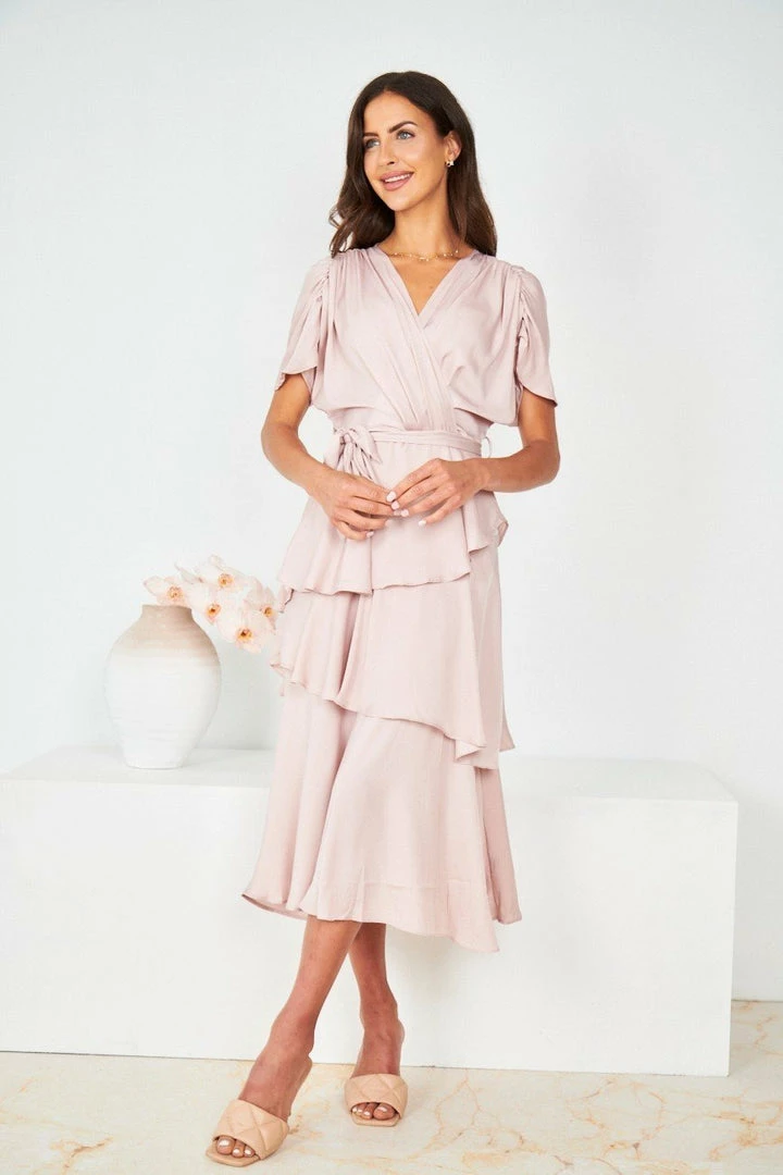 Our Gabbie Dress is a show stopper. This eye-catching blush-toned midi features a V neckline, petal sleeves, fabric waist tie to cinch in the figure, and a flowy gathered tiered skirt. Pair with your favorite nude strappy heels for a sophisticated look.