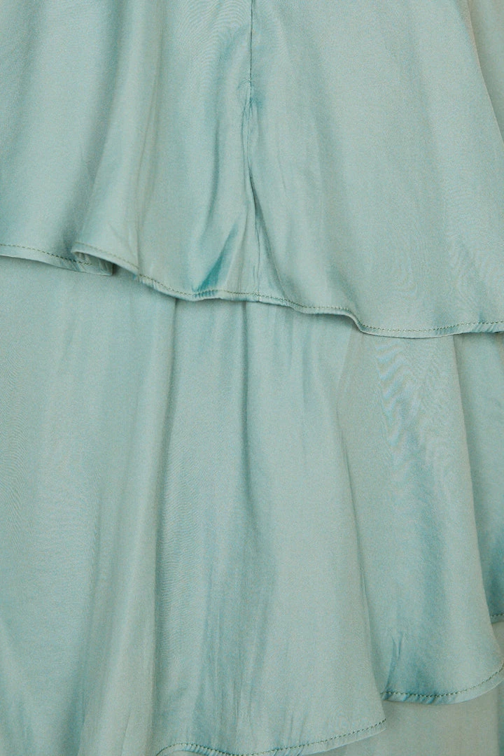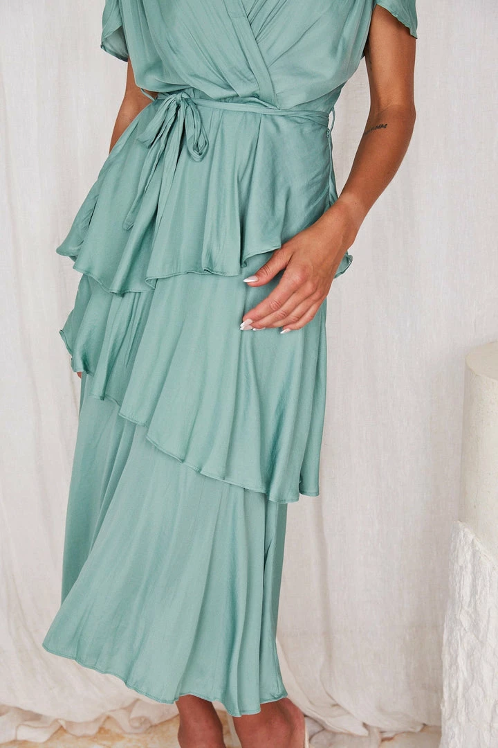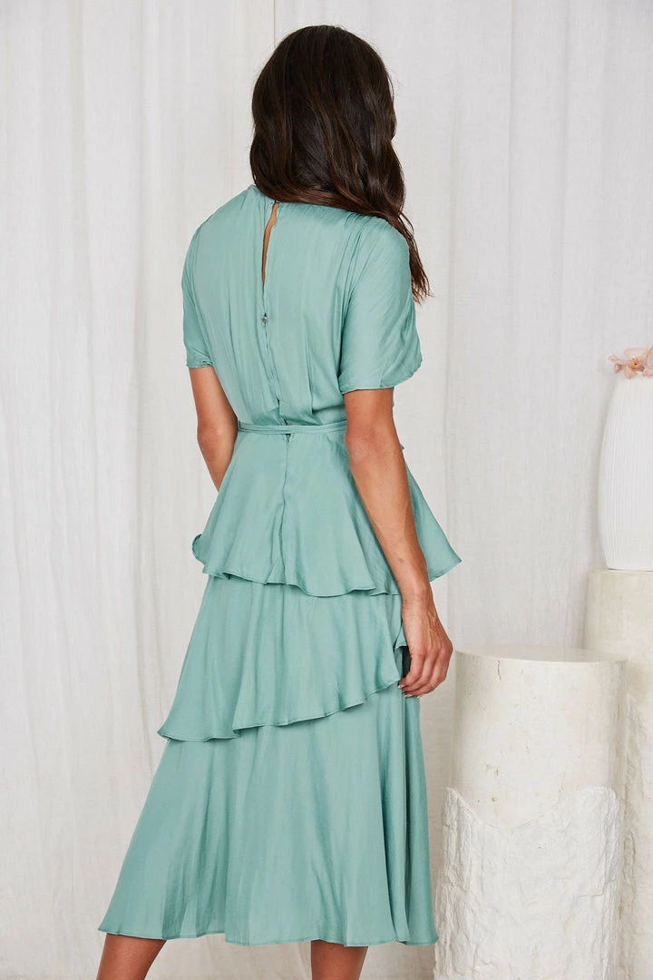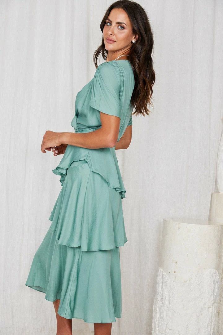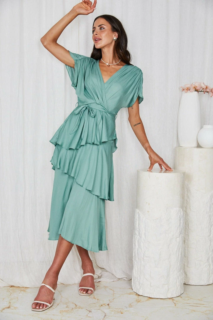 Our Gabbie Dress is a show stopper. This eye-catching midi features a V neckline, petal sleeves, fabric waist tie to cinch in the figure, and a flowy gathered tiered skirt. Pair with your favourite nude strappy heels for a sophisticated look.