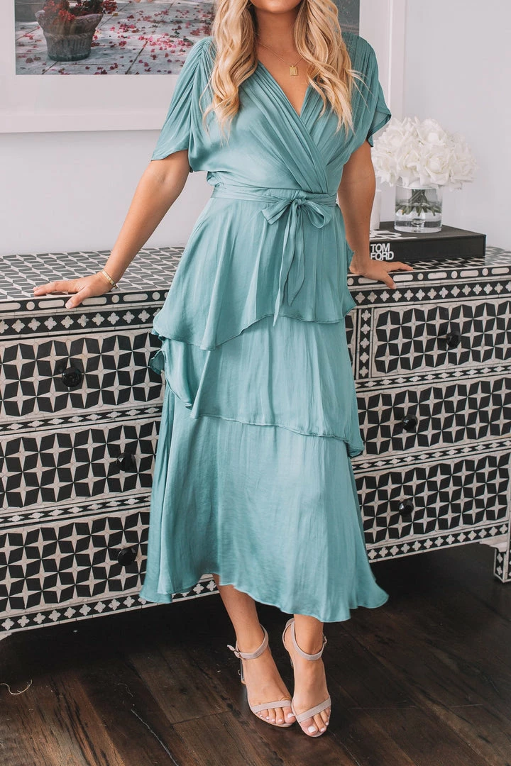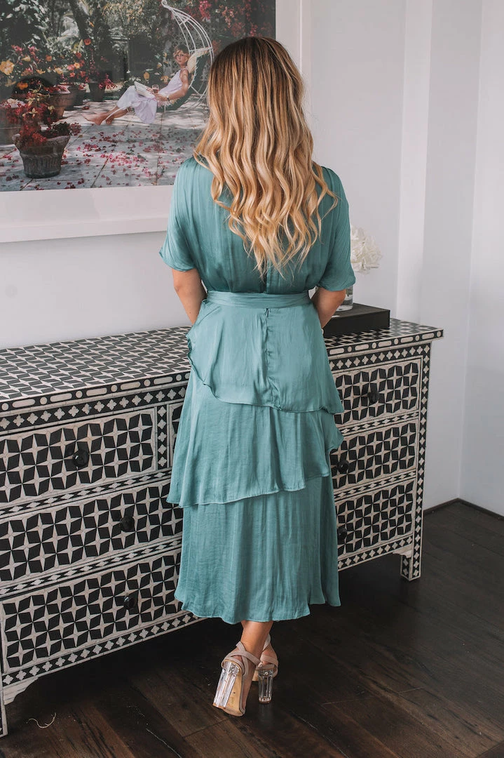 Our Gabbie Dress is a show stopper. This eye-catching teal-toned midi features a V neckline, petal sleeves, fabric waist tie to cinch in the figure, and a flowy gathered tiered skirt. Pair with your favourite nude strappy heels for a sophisticated look.