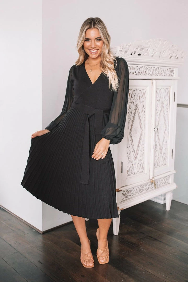 Our Martina Dress comes in a gorgeous deep black tone. This relaxed mini features a wrap style v neckline and tie front detailing to cinch in the figure beautifully. The long bishop sleeves are cinched on the cuffs for a dash of drama!