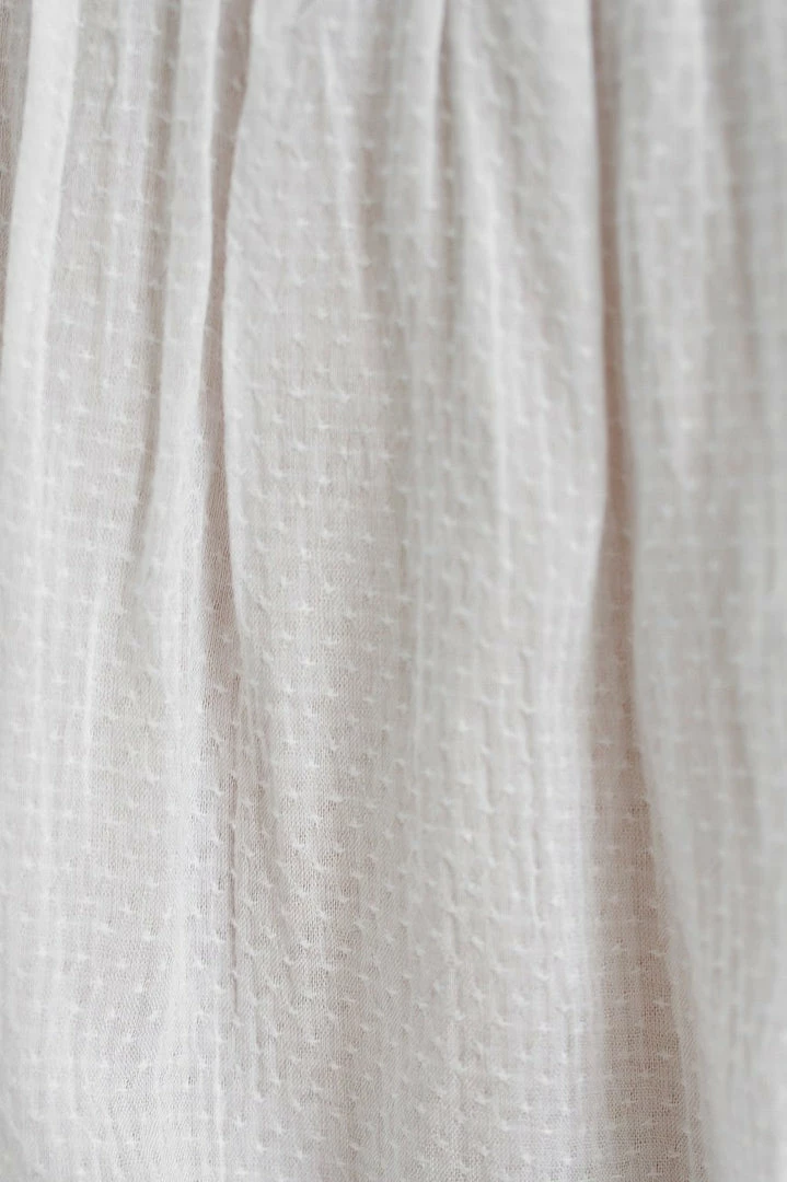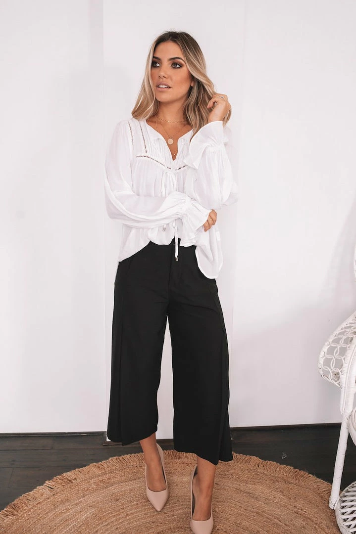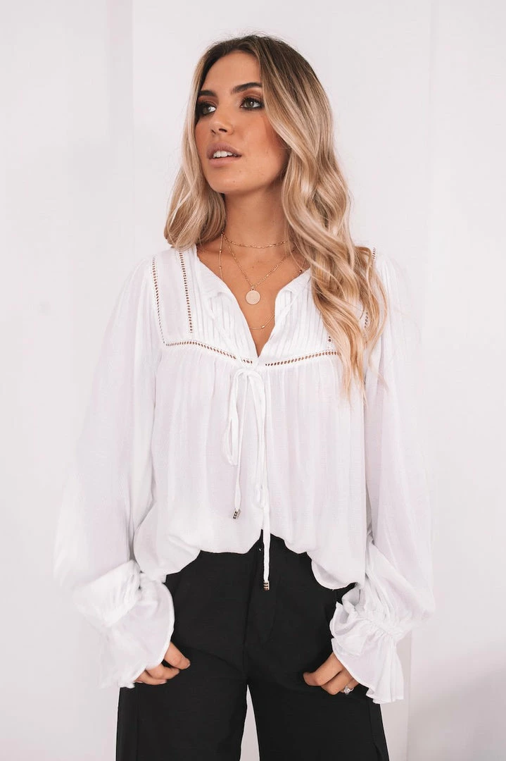 Our Emma Top comes in a fresh white tone. The V neckline with tie detailing, ladder lace detailing across the chest, and cinched sleeves with frill detailing are stunning additions to this piece. This blouse can be easily dressed up for everyday wear or even for the office.
