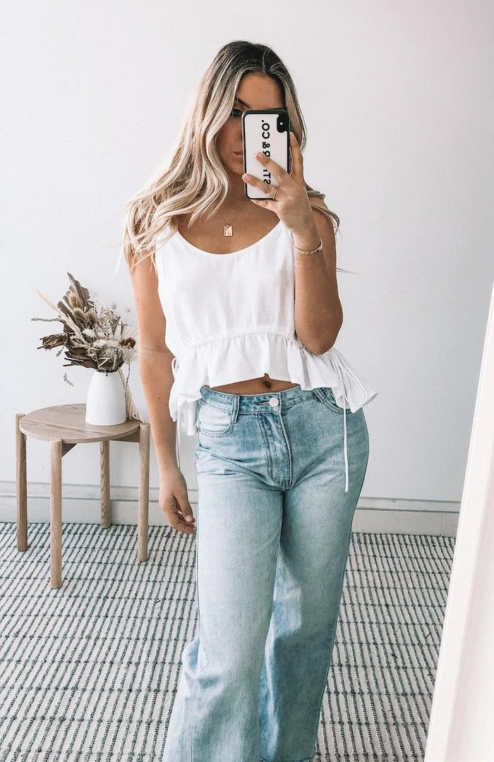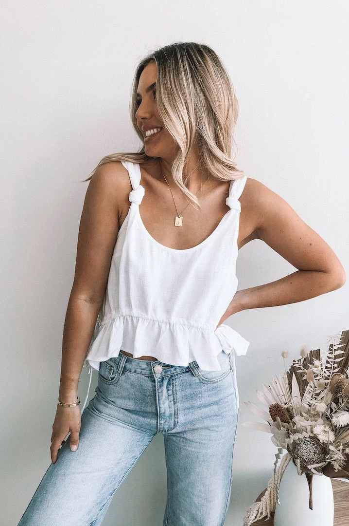 Our Ampla Top is an easy breezy white top with fun features such as knot straps, frill high low hemline & adjustable ties on the sides. This fresh white toned top in the relaxed fit is great for the warmer weather to come & pairs beautifully with gold accessories and denim.