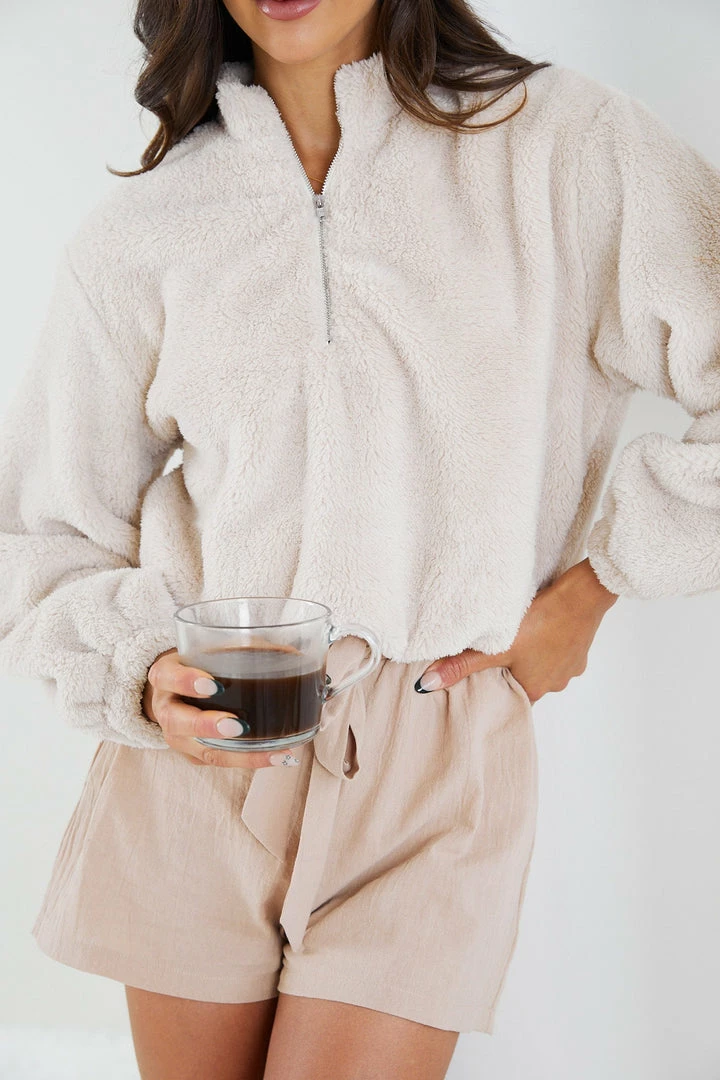 Our Arima Knit comes in a warm beige tone. This cropped teddy knit features a high collar, long relaxed sleeves, and a zipper on the front. This fluffy piece is perfect for laying during the cold winter months ahead!