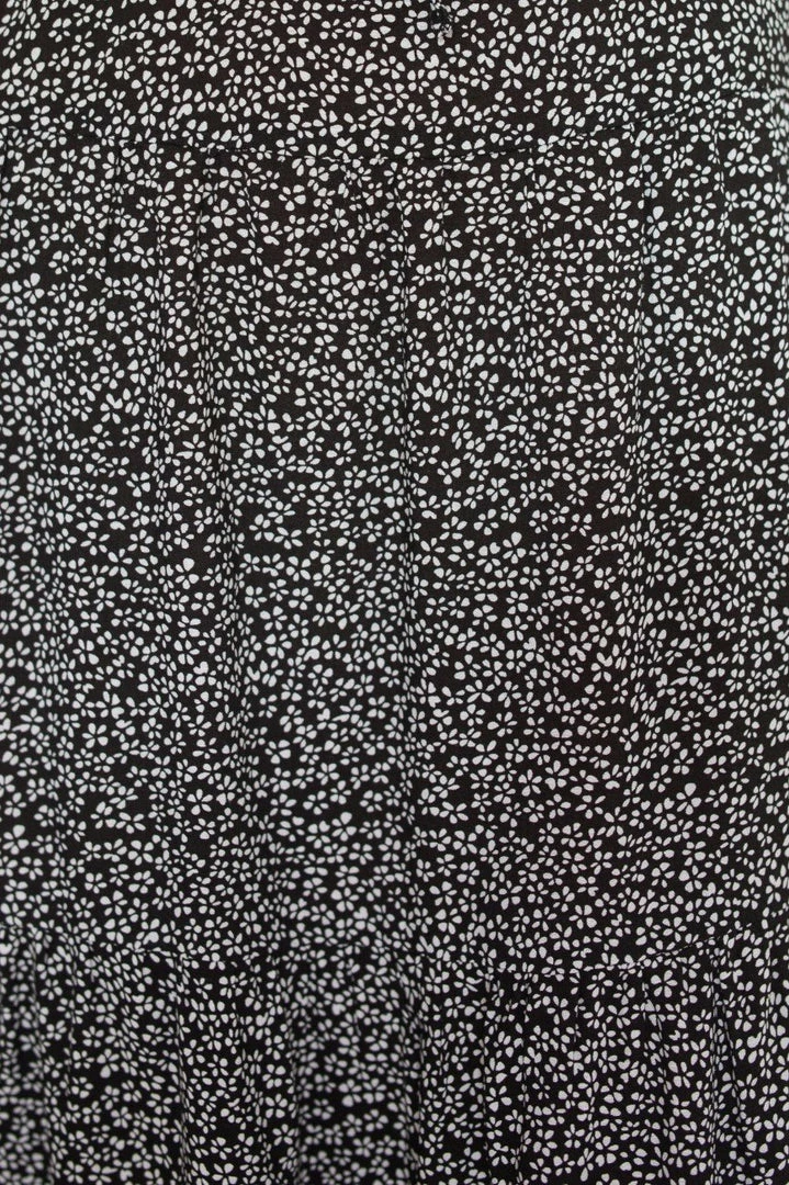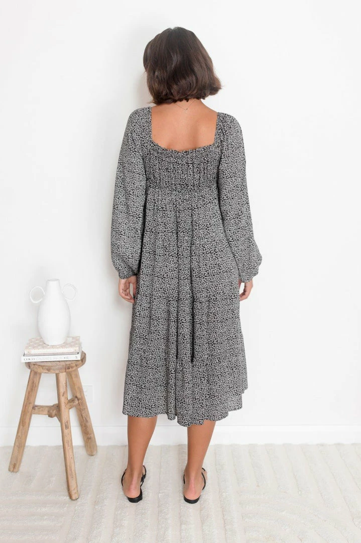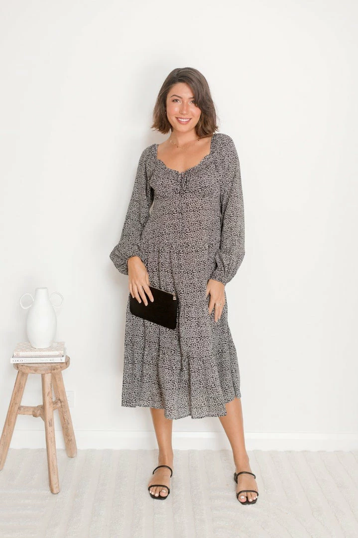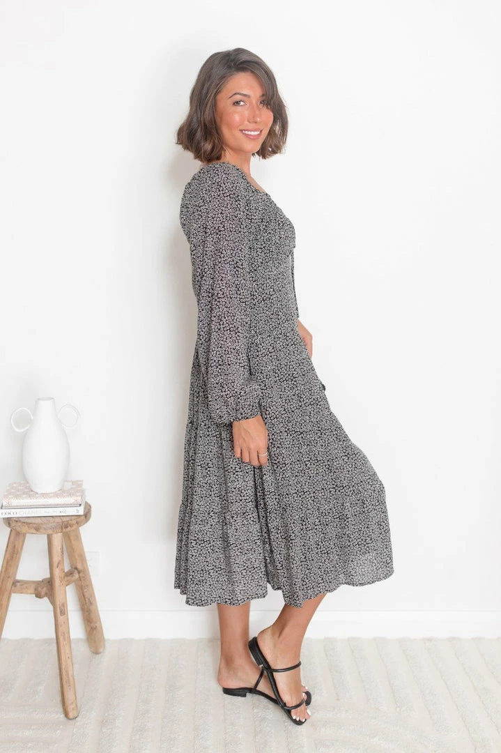 Our Arrosa Dress comes in a deep black tone, with a contrasting white floral print. It features a scoop neckline, long relaxed sleeves and a tiered skirt. This casual midi pairs perfectly with tan sandals for an effortless transseasonal look!