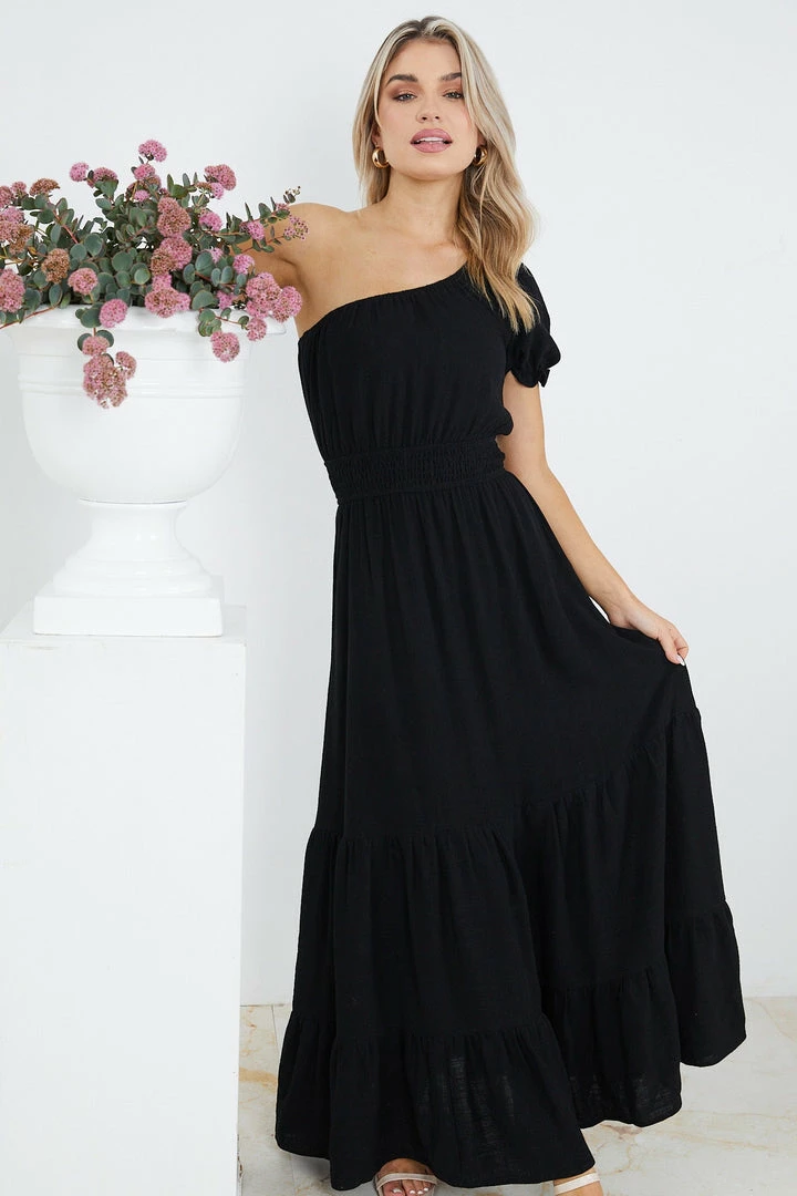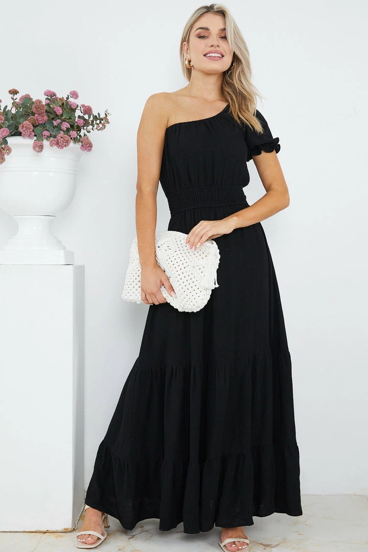 Our Beckas Dress comes in a classic black tone. This maxi features one shoulder with short puff sleeves, an elastic waistband and a flowy tiered skirt! The relaxed fit pairs beautifully with tan sandals and gold accessories.