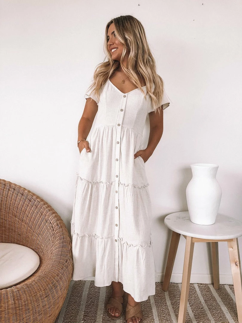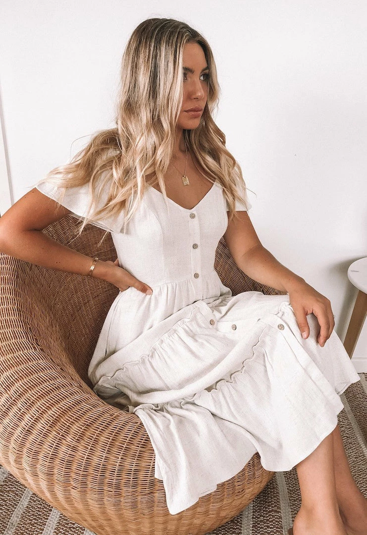 Our Celie Dress comes in a classic beige tone. This relaxed midi features a soft V neckline, elasticated shoulders, and frill detailing on the skirt. This breezy summer staple pairs beautifully with tan sandals and a sunhat.