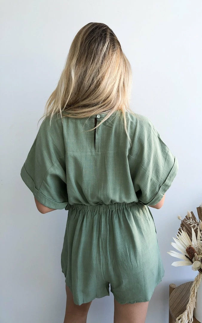 Our Acacia Playsuit comes in a gorgeous earthy khaki tone in a relaxed fit. The v neckline and waist tie are perfect additions to this simple yet cute playsuit that is perfect for grabbing brunch with the girls.