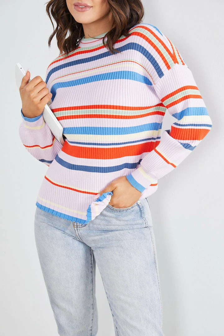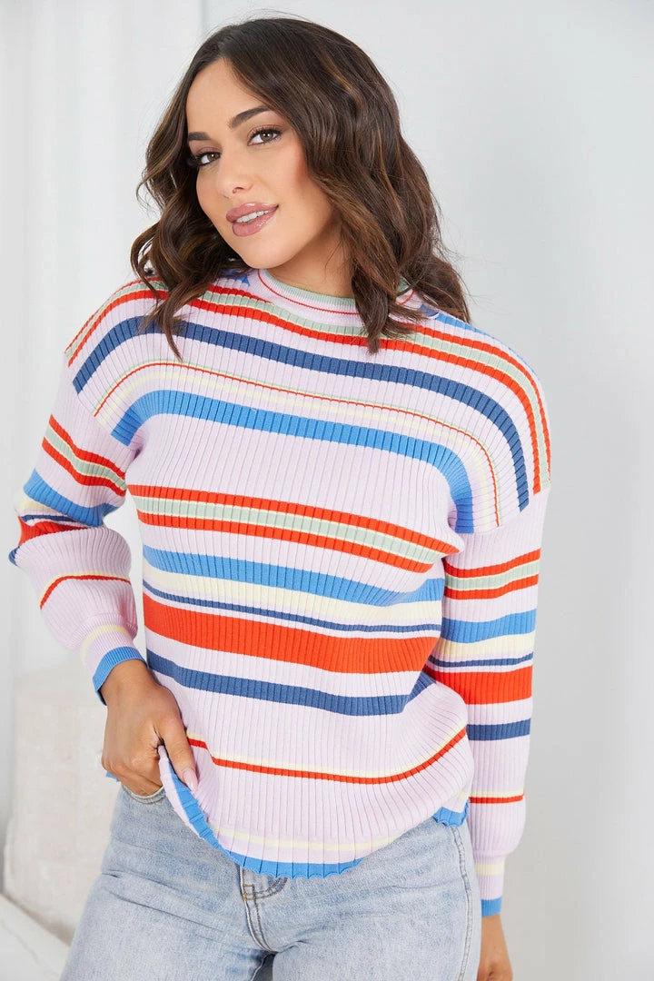 Our Dayla Knit comes in a beautiful stripe print in the shades of pink, red, blue, yellow and green. Like a candy from a store you can’t resist, this jumper is a sweet addition to your winter wardrobe. It features a round neckline, long drop sleeves and fun line pattern play in different hues that amazingly pairs well with a similar tone bottom and shoes!