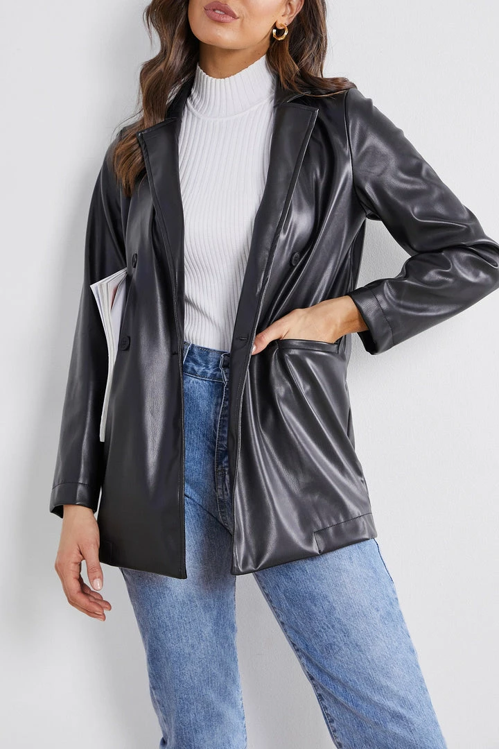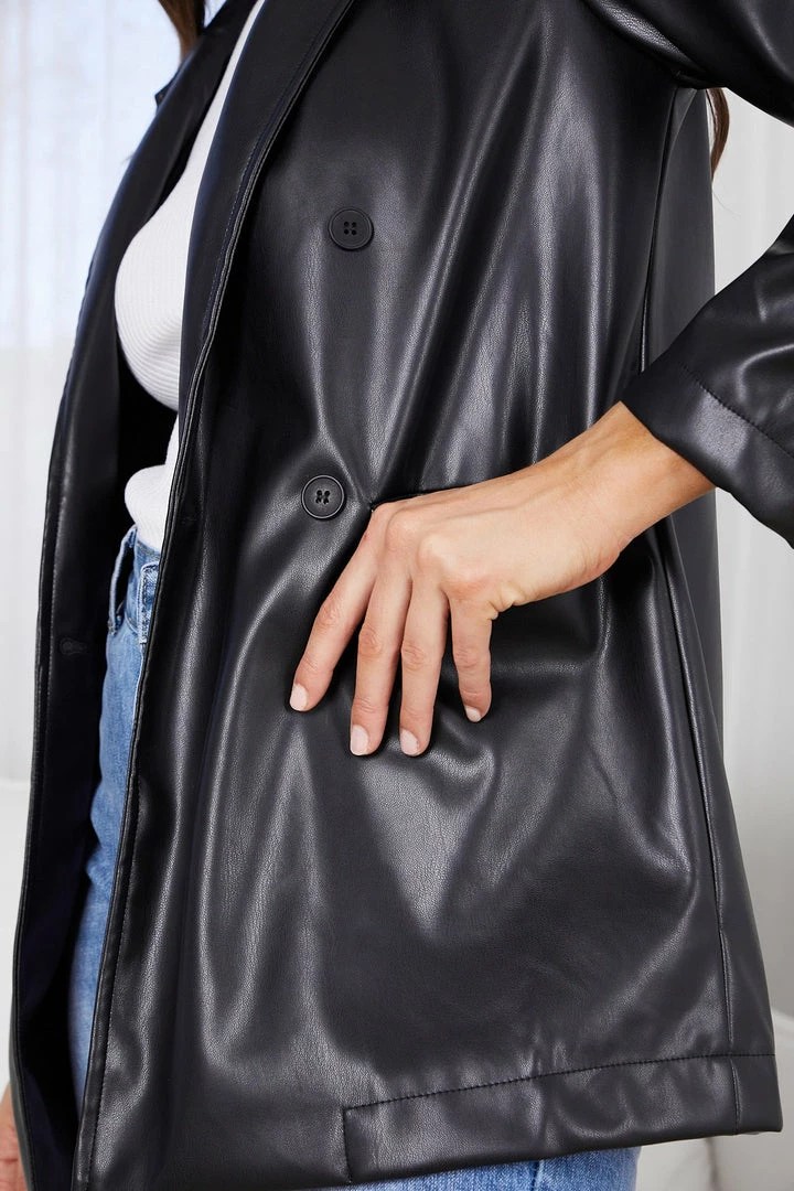 - Key Features: Notched collar. Functional buttons. Long sleeves. PU. Functional pockets. 4 decorative buttons on front sides & 1 functional button on front. Sheen to fabric. (no shoulder pads)