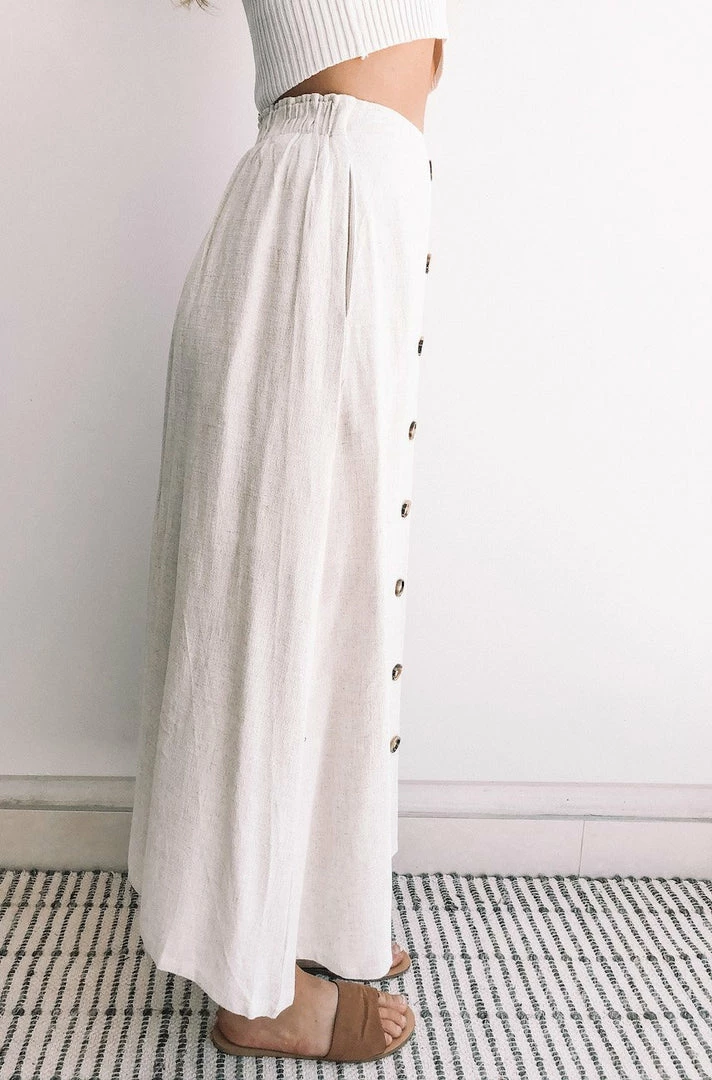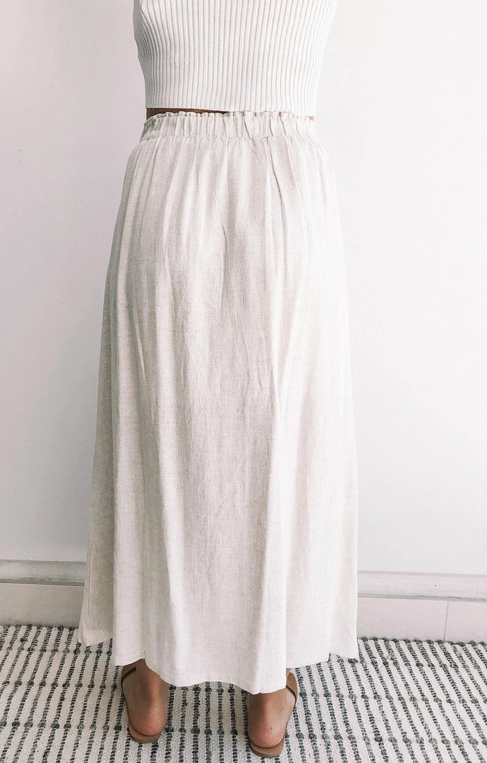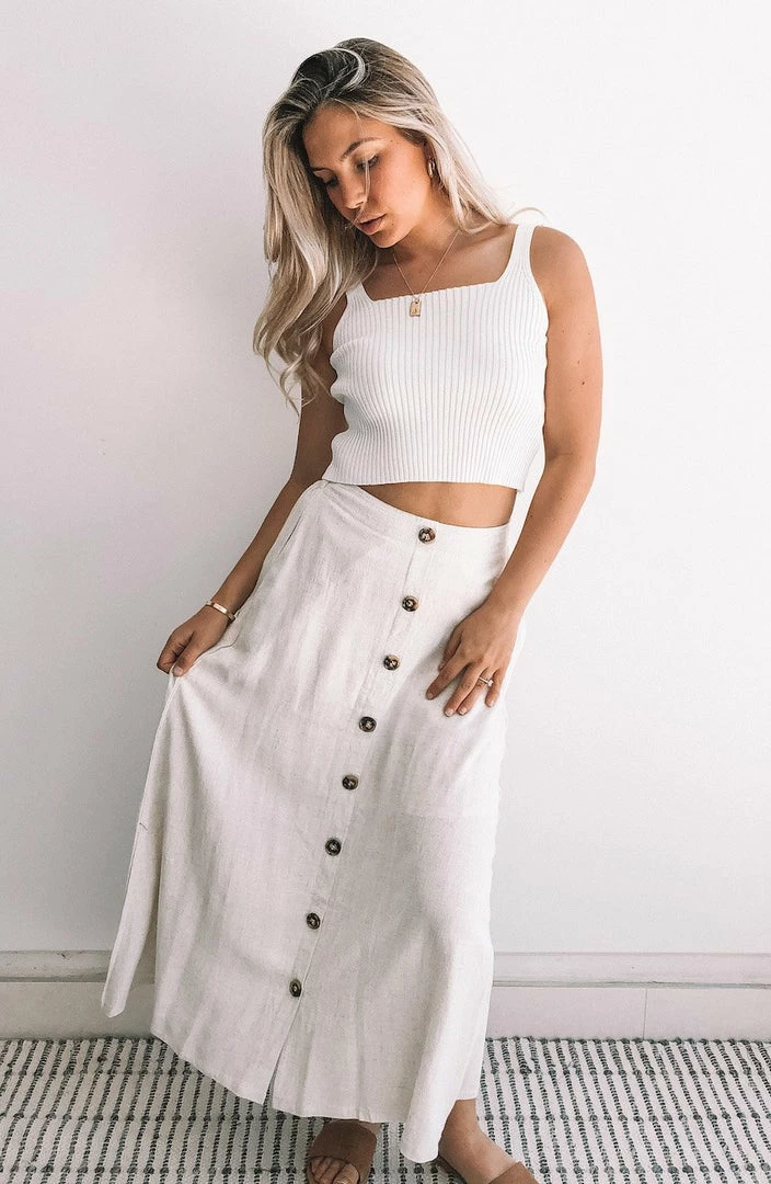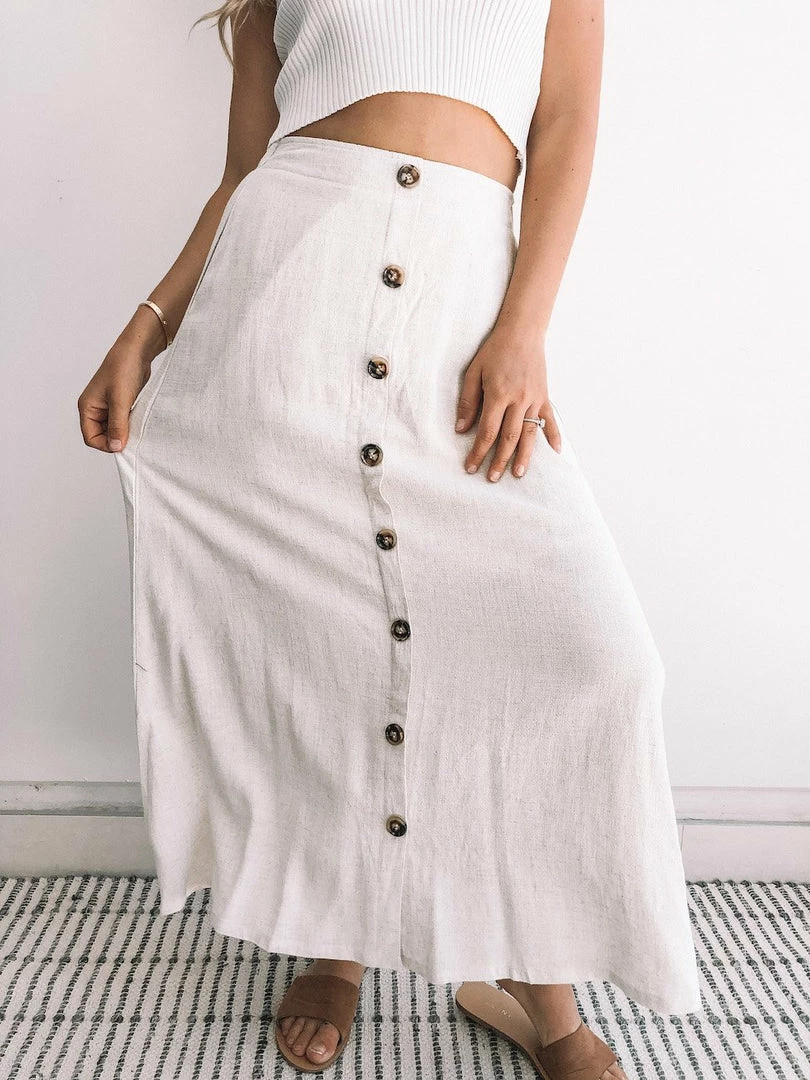 Tullie is 163 cm tall, and has an 85 cm bust, 64 cm waist, & 85 cm hips. She is wearing a S / AU 8 / US 4. This skirt is true to size. - Key Features: Midi length. Relaxed fit. A-line. Decorative buttons on the front. Elastic waist. Pockets (winning)