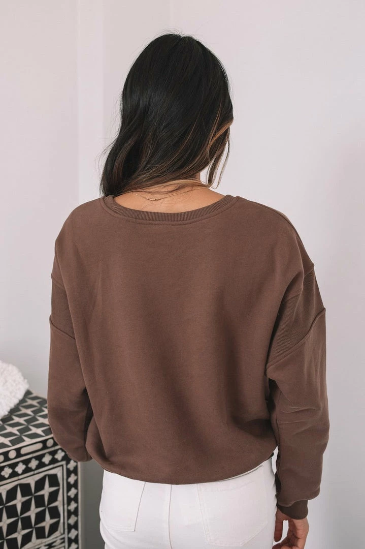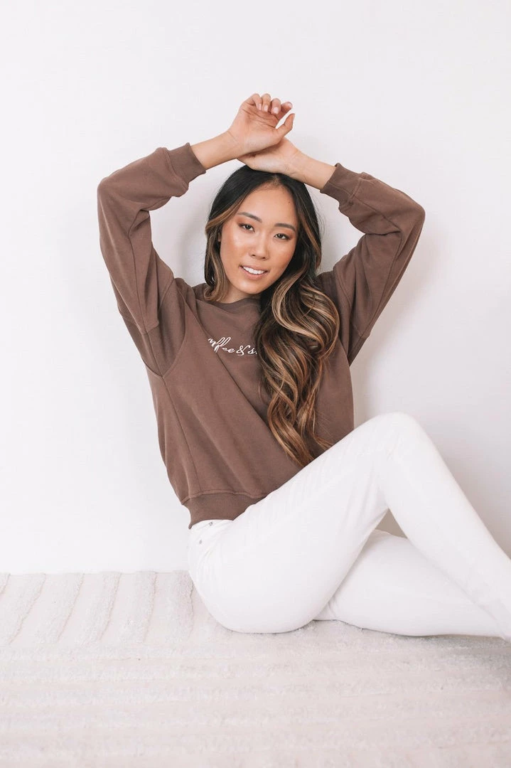 Our Koffee Jumper comes in a chocolate tone featuring a ‘coffee & sundays’ print in white. This pull-on jumper features a round neckline and rib detailing on sleeves and hem. This cozy piece is perfect for relaxing into the weekend with a big cup of coffee.