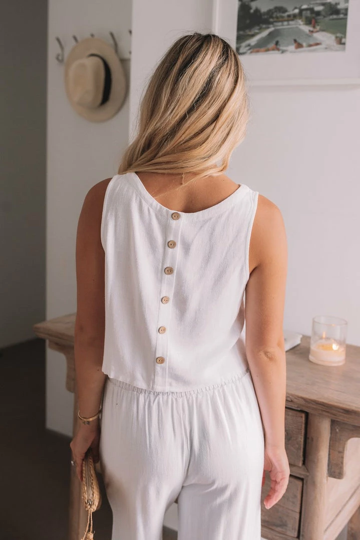 This fresh white toned cropped top is a gorgeous basic you’re sure to love. The cute button up detail at the back provides more of an edge to this natural fibre basic. Pair with our chic Lighthouse Pants for the ultimate breezy, off-duty style.