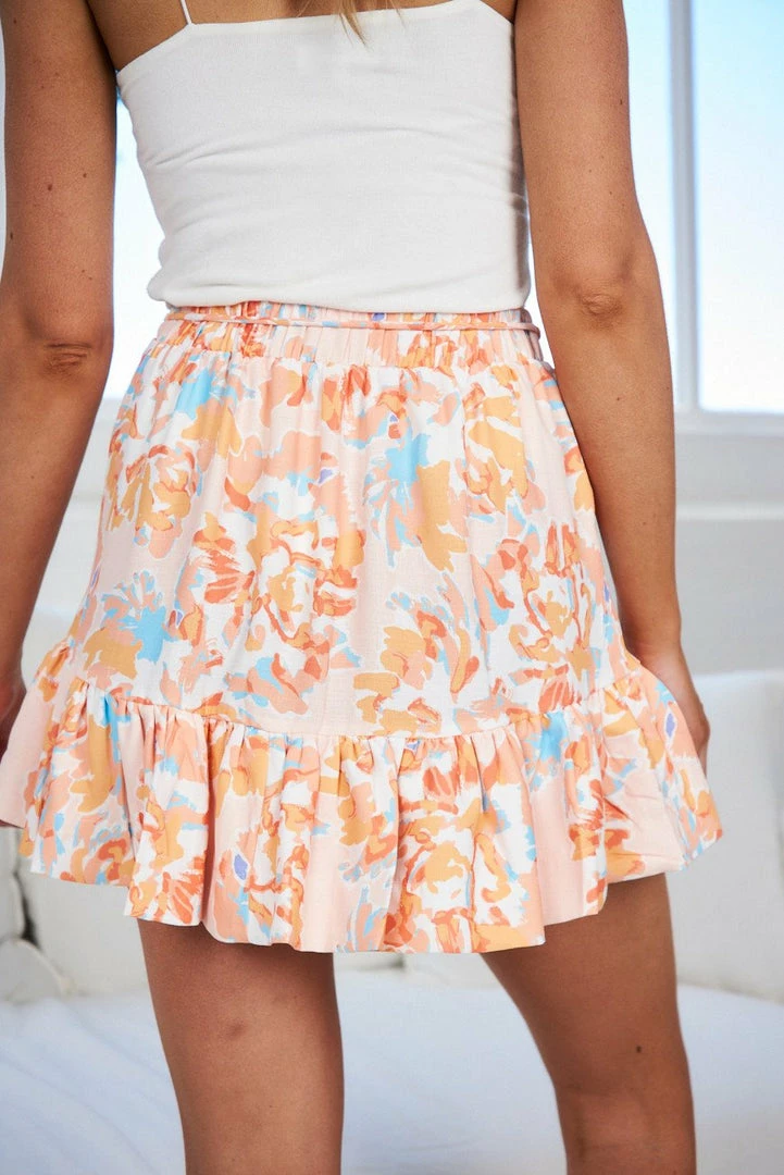 Our Lorayne Skirt comes in a pink blush tone base, with a light blue, yellow & red tone print. It features a mini length and a fabric waist tie. This mini skirt is a cute addition to your spring wardrobe!