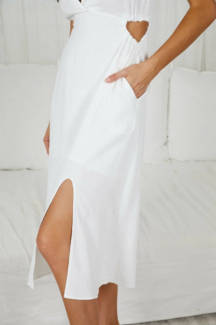 Our Denna Dress comes in a white tone color. This dress features a classic collar, v neckline, with cut outs on the side and is fitted through the hip before falling to a midi length hem.
