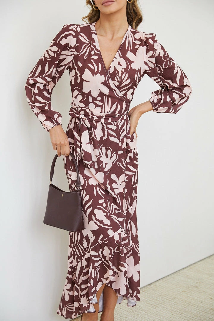 Our Fendexe Dress comes in a stunning burgundy base with blush floral prints. Highlighting your most stylish fashion journey, this luxurious maxi is a true wrap style designed with a surplice neckline, long elasticated bishop sleeves, fabric waist belt and high-low hem. Take your glam game to a new height by pairing this with gold accessories and shiny block heels!