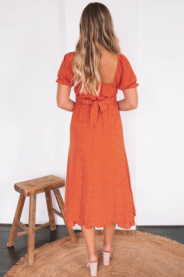 Our Maxie Dress comes in a vibrant rust-orange tone featuring an abstract print. This summery midi features a square neckline, gathered detailing on the bust, cinched puff sleeves with frill detailing & fabric waist tie to cinch in the figure. This feminine yet stand out midi is perfect for weekend events!