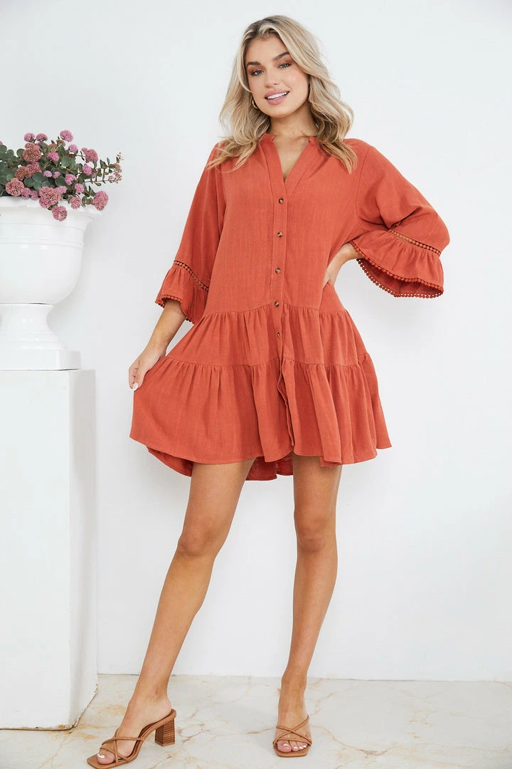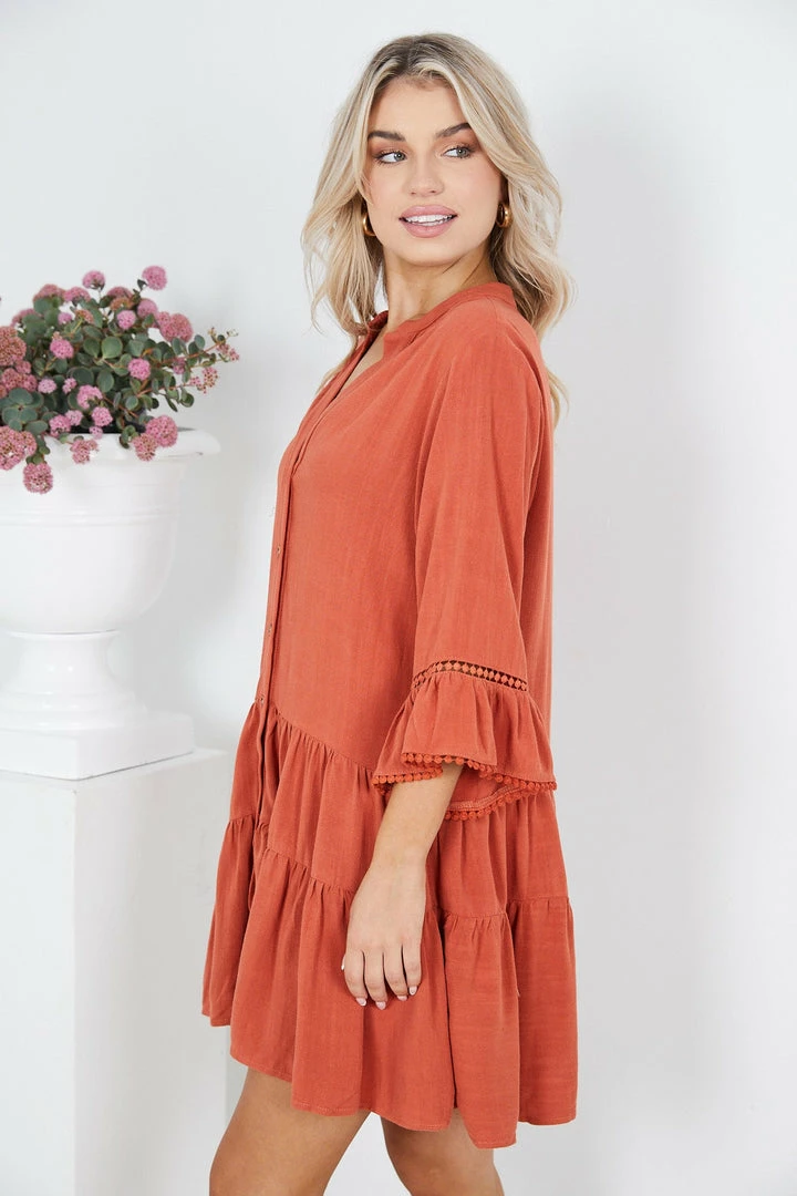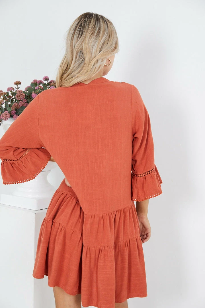Our Zoya Dress comes in a rust tone color. This mini features a V neckline, 3/4 sleeves with mini tassel details on the hem, a tiered skirt, and functional buttons down the front perfect for new mums, and is breastfeeding friendly!