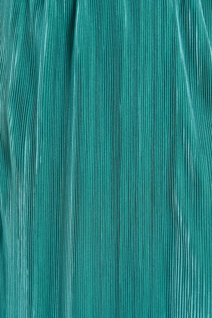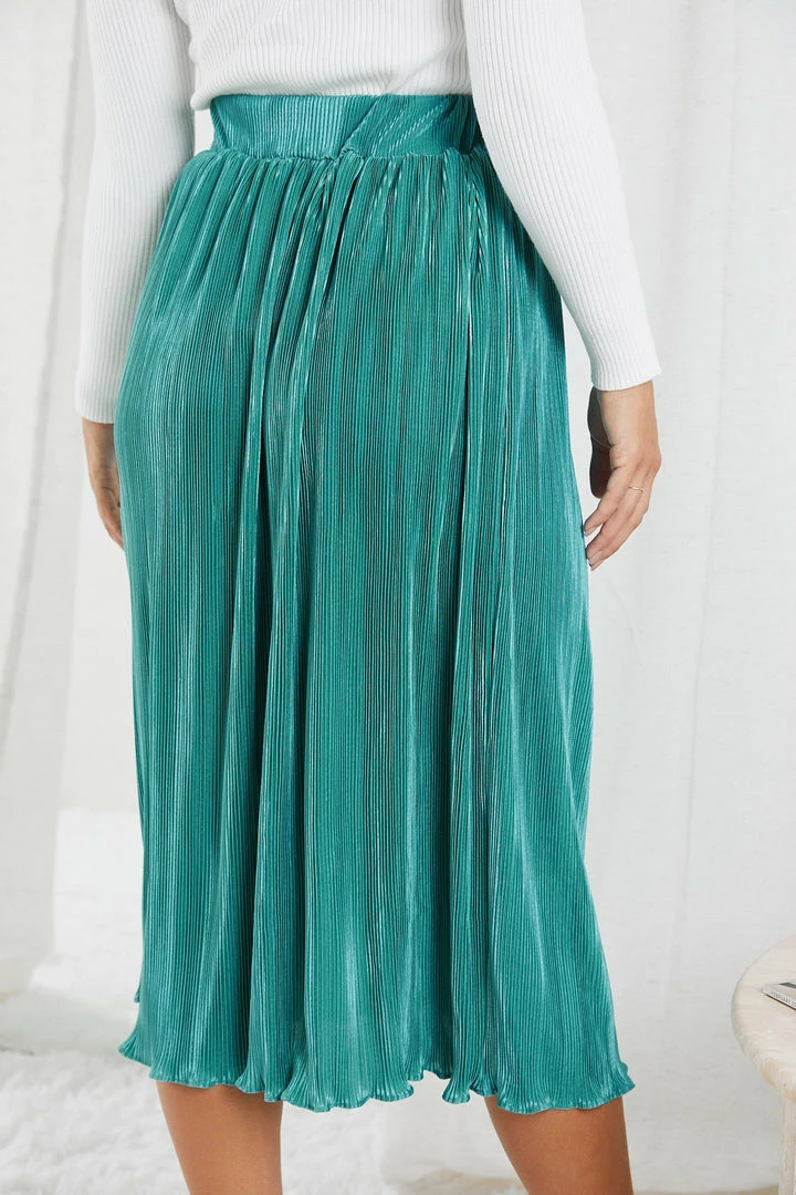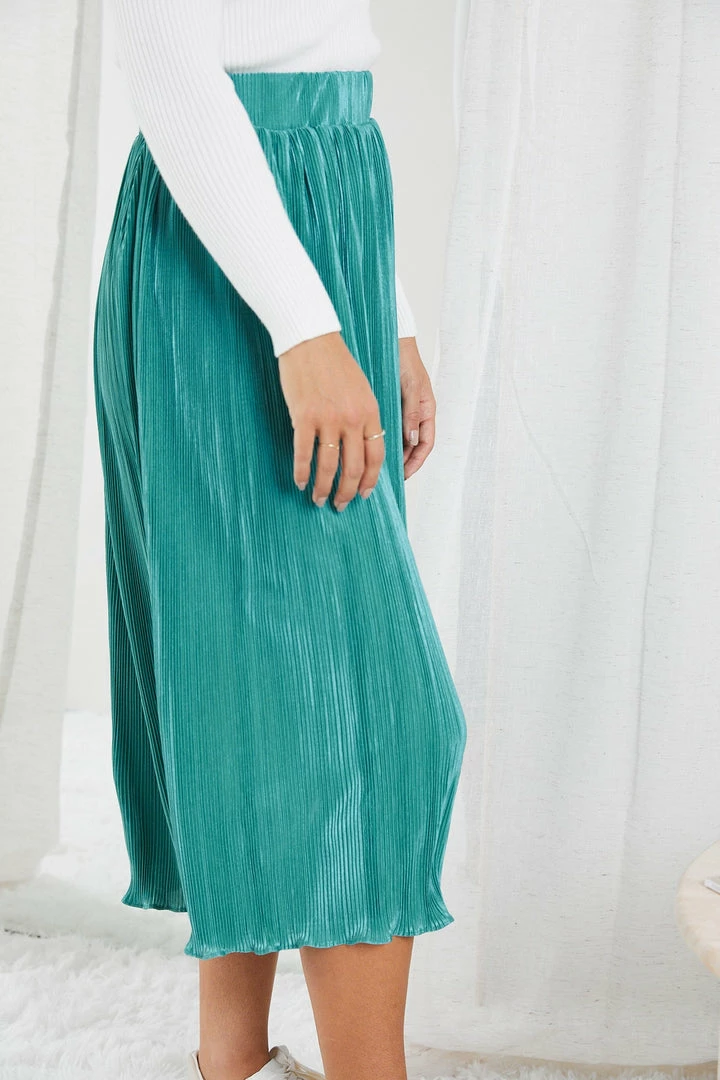 Our Elisheba Skirt comes in a sophisticated teal colour. Lead the fashion revolution in confidence in this midaxi length skirt featuring a waistband and a plisse fabric creating a captivating texture to its look. Pair with a sling back heels for a vintage chic outfit.