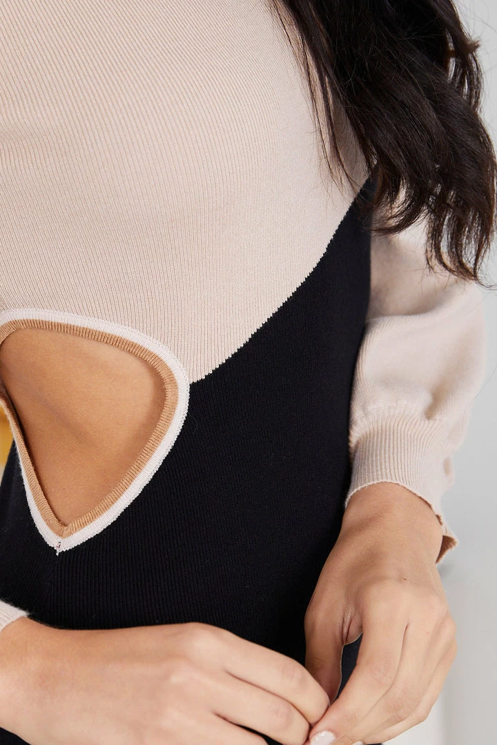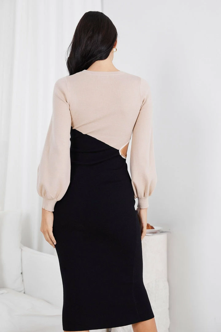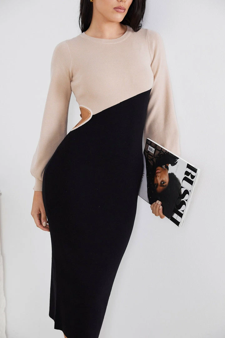 Our Haley Knit Dress comes in a beautiful contrasting colours of black and camel. Fashionably stitched together with the influential woman in mind, this bodycon is designed with a round neckline, long cuffed bishop sleeves, side waist cutouts, midi length and colour blocking detail. Elevate your look with leather sandals and a pair of cute earrings!