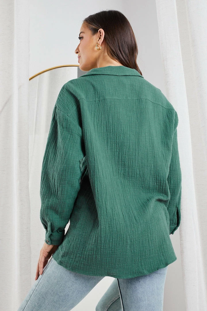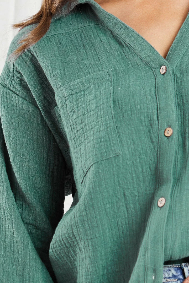 Our Helenus Shirt comes in a green-tone colour. Create a timeless look in this classic long-sleeved shirt. Made with a cotton blend material, the fit is oversized, featuring a collared neckline, chest pocket, and button-down fastening. Throw it on as a light layer over printed summer dresses, or tuck it into jeans or trousers – either way, this piece will be a staple in your wardrobe throughout the seasons!