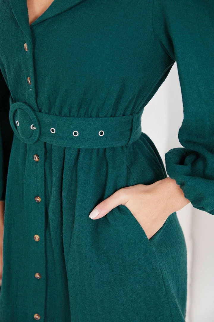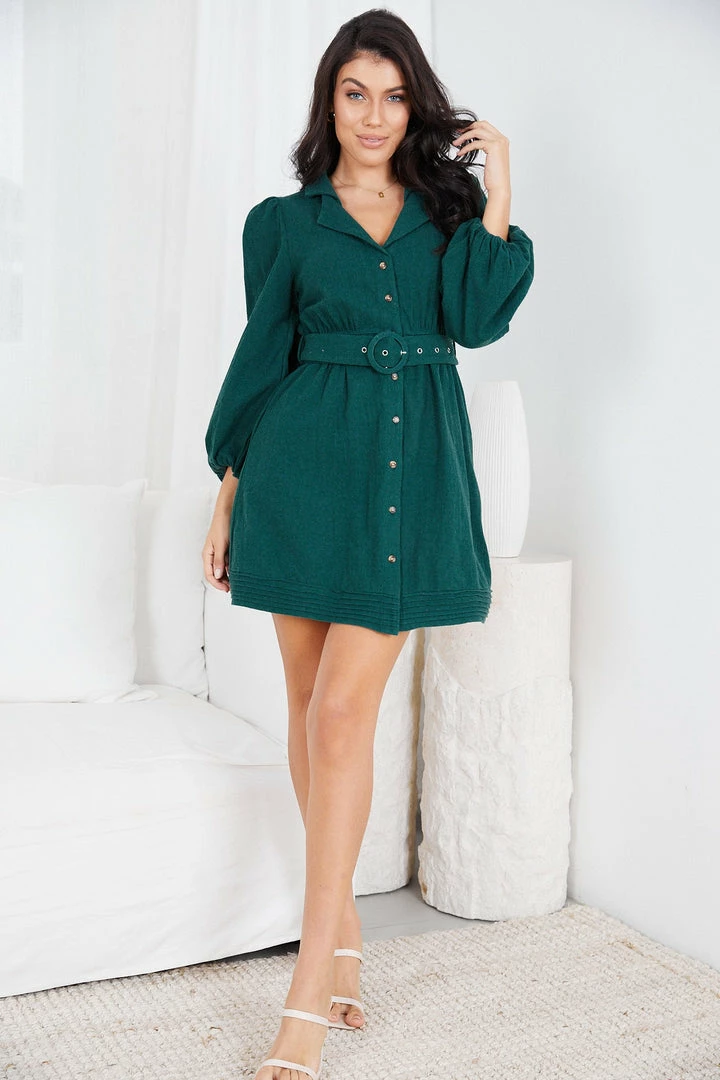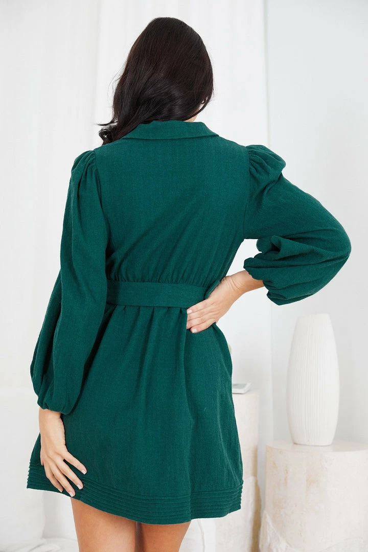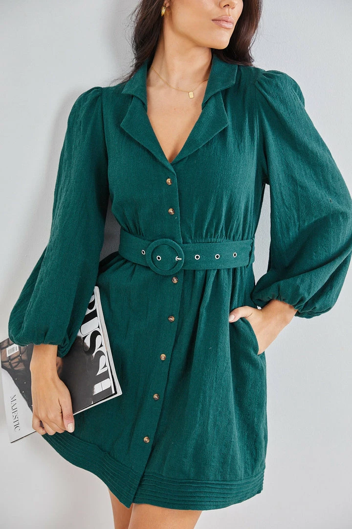 Our Inezza Dress comes in a sophisticated emerald green colour. Your style’s the window to your elegance, display it fashionably in this mini that features a lapel collar, deep v-neckline, button closure, long bishop sleeves, a-line skirt with slight gathering on the waist and buckled belt. Stand out by pairing this with a byzantine chain necklace, stockings and pump heels!
