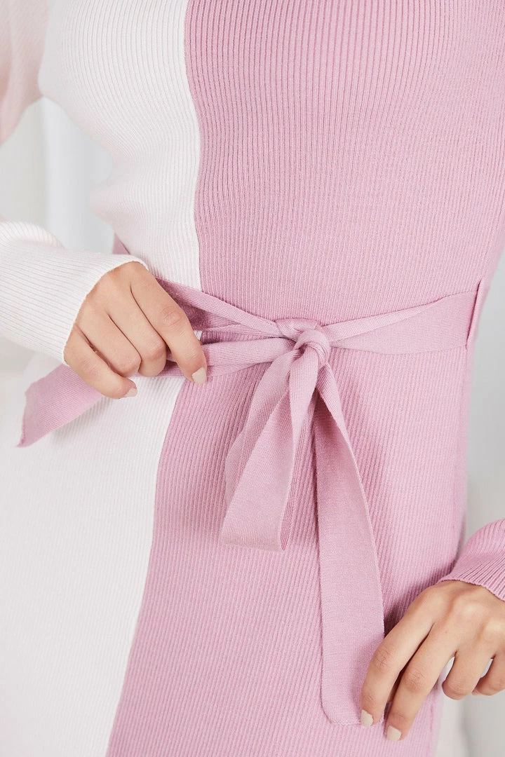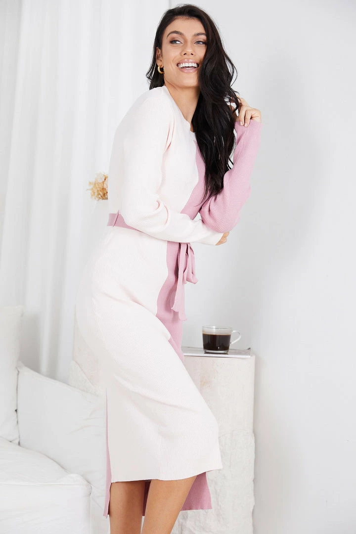 Our Ivane Knit comes in a beautiful colour blocking in the shades of pink. When in doubt, be extra in this knit dress that is designed with a round neckline, long sleeves, paneled detailing, fabric waist tie, midaxi length and asymmetrical hemline.