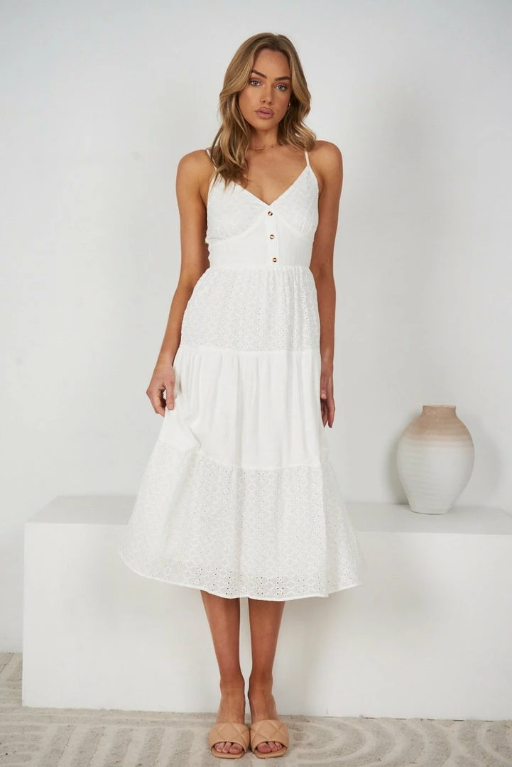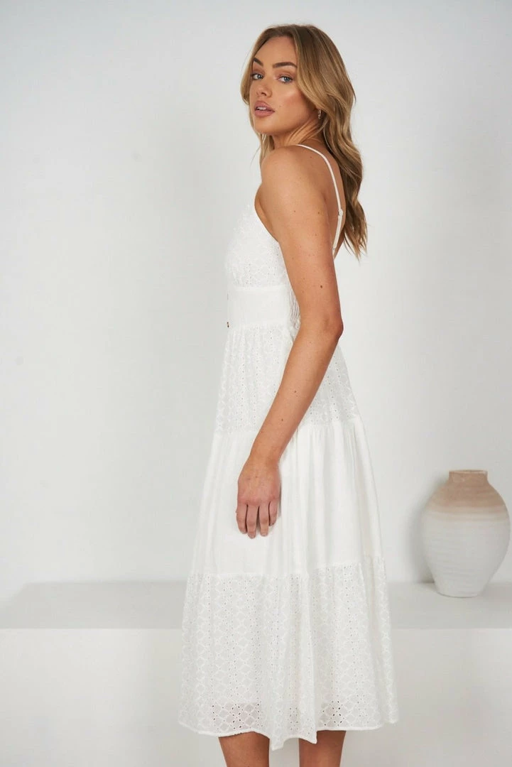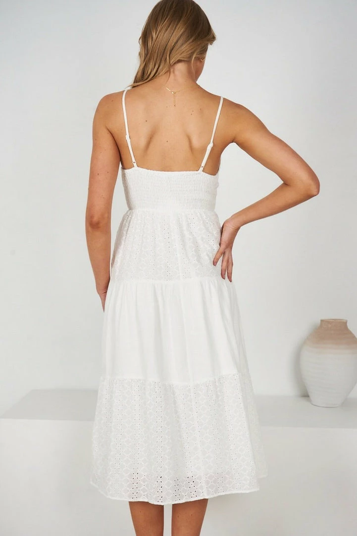 Our Kody Dress comes in a fresh white tone. It features a v neckline and spaghetti straps for a relaxed, comfortable fit. This flowy midi pairs beautifully with heels for an effortless transseasonal look!