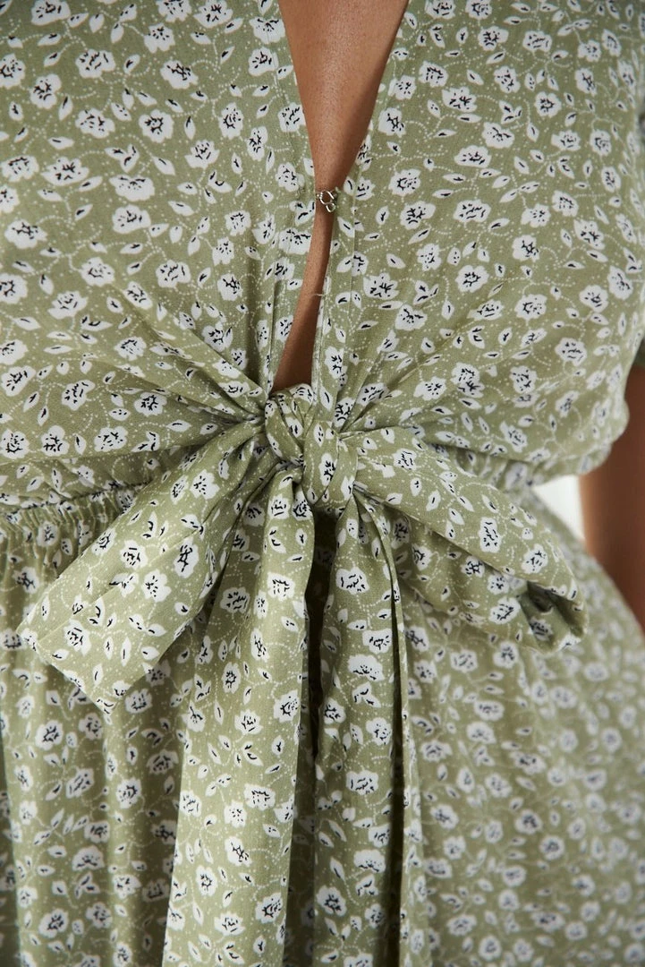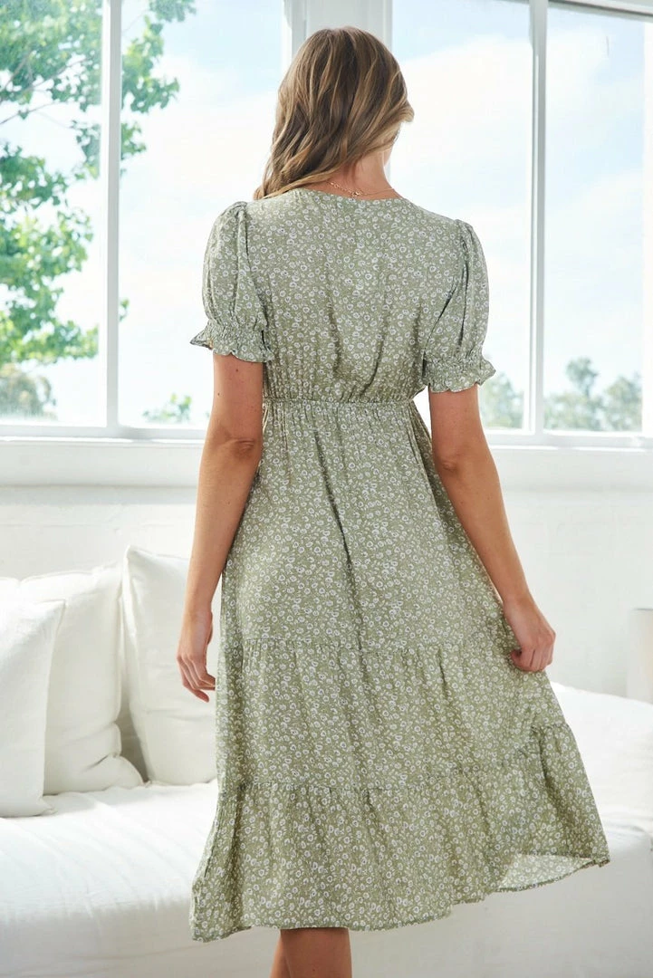 Our Laurissa Dress comes in a subtle sage tone base, with a white tone print. It features a v neckline, short sleeves, and tie detailing at the front. This flowy midi pairs beautifully with heels for a stunning seasonal look!