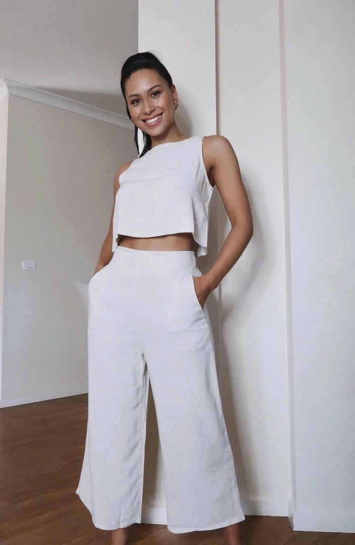 This cute cropped fit in a gorgeous oatmeal colour is great to wear with any cardigan. The cute button up detail at the back gives more of an edge to this natural fibre basic. Pair with our chic Lizzo Top for the ultimate breezy, off-duty style.