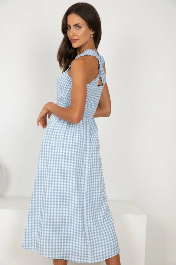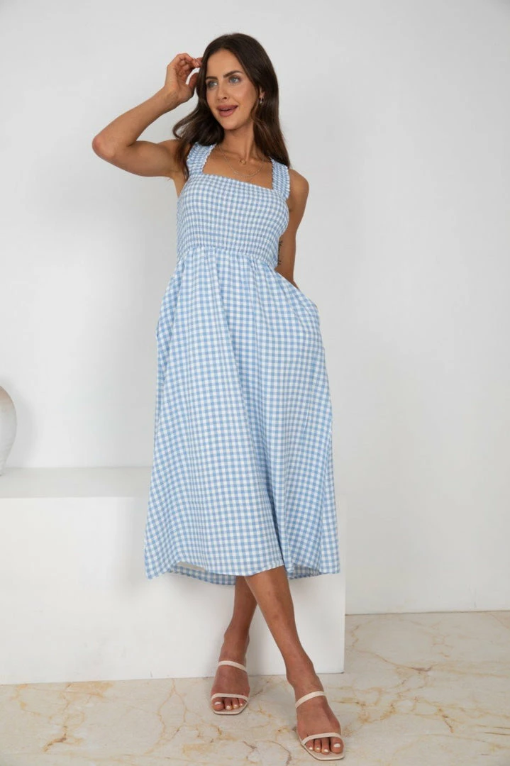 Our Mackenzie Dress comes in a blue and white tone gingham print. It features a square neckline, and short sleeves for a relaxed, comfortable fit. This flowy midi is a wonderful addition to your spring wardrobe!