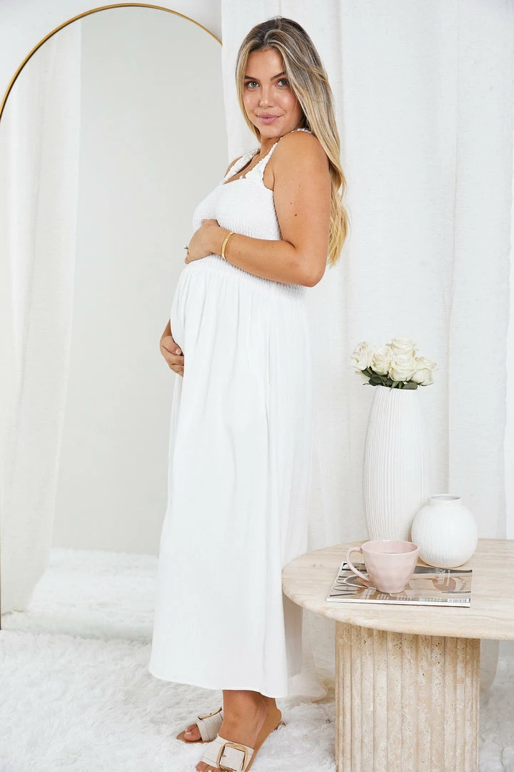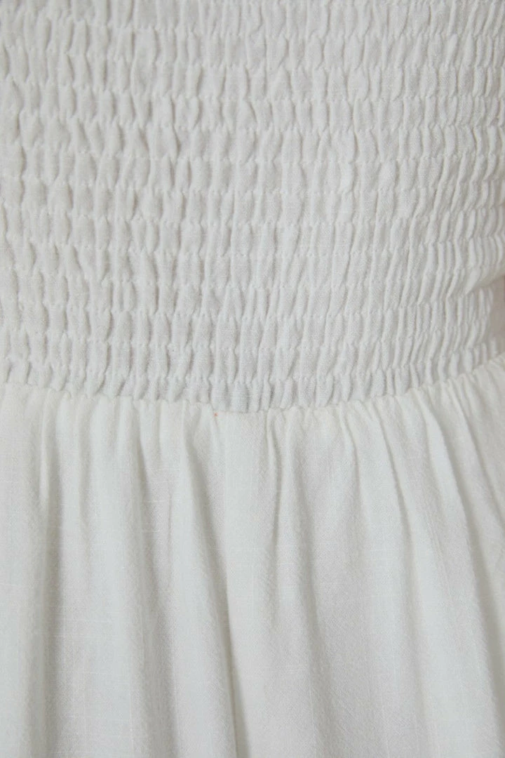 Our Makayla Dress comes in a fresh white tone. It features a v neckline, and short sleeves for a relaxed, comfortable fit. This flowy midi is a wonderful addition to your spring wardrobe!