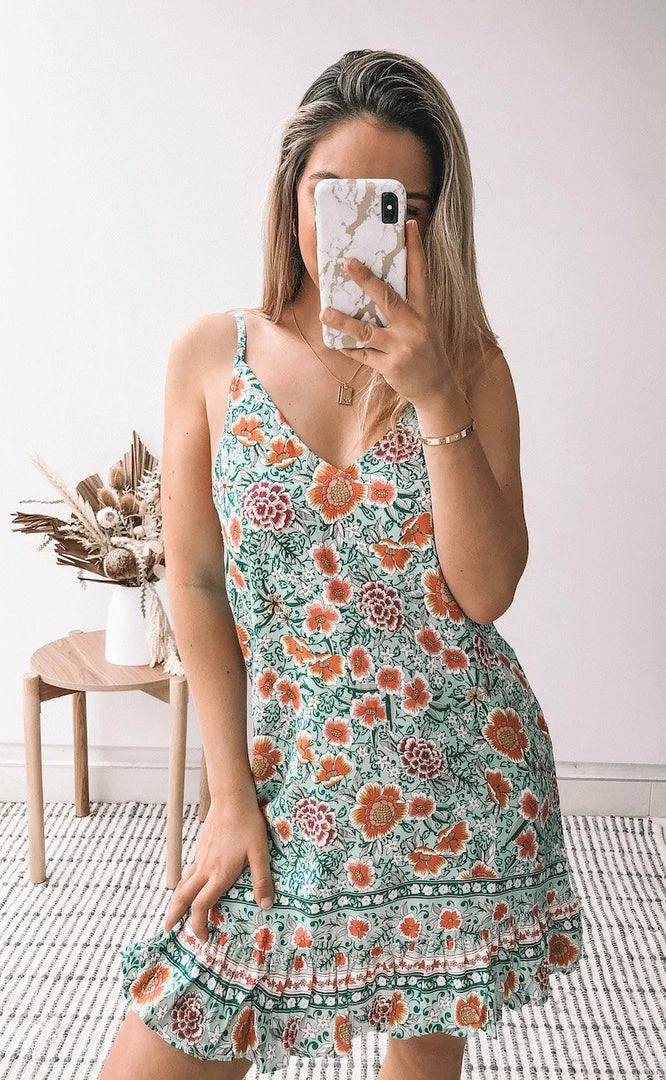 Our Narooma Dress is a calming sage base with dark green, mint, wine-purple, marigold, orange, cream, dark teal, light yellow & off-white floral print. It’s a gorgeous light weight material in a relaxed straight fit perfect for running errands or strolls with the girls. The v neckline is beautiful paired with silver necklaces. The spaghetti straps are adjustable allowing for customisability in the bust. Dress down with white sneakers or dress up in strappy heels.