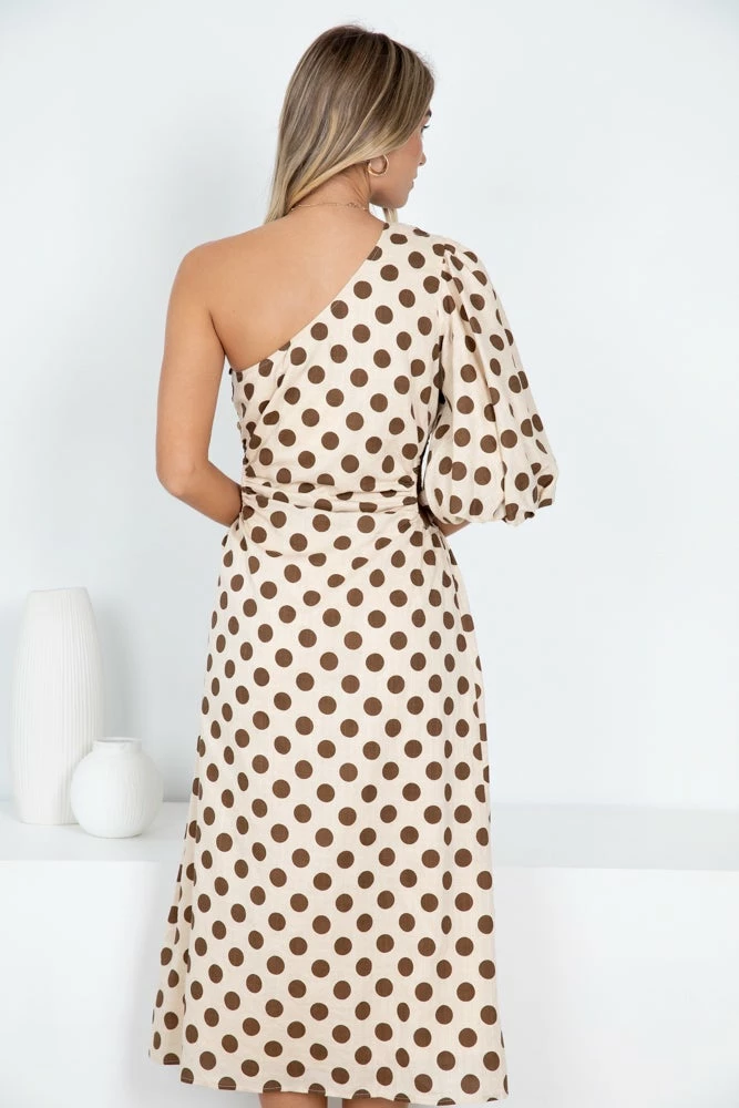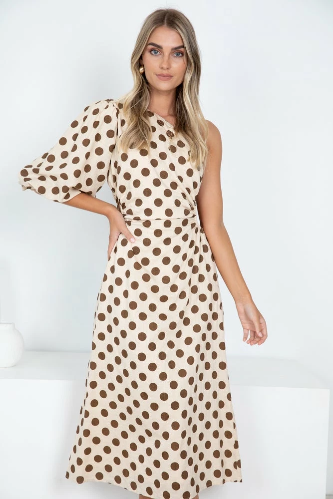 Our Ondrea Dress comes in a beige tone base, with a brown tone spot print. It features an asymmetric neckline and a short bishop sleeve on the wearer’s left for a relaxed, comfortable fit. This flowy midi is a gorgeous addition to your spring wardrobe!