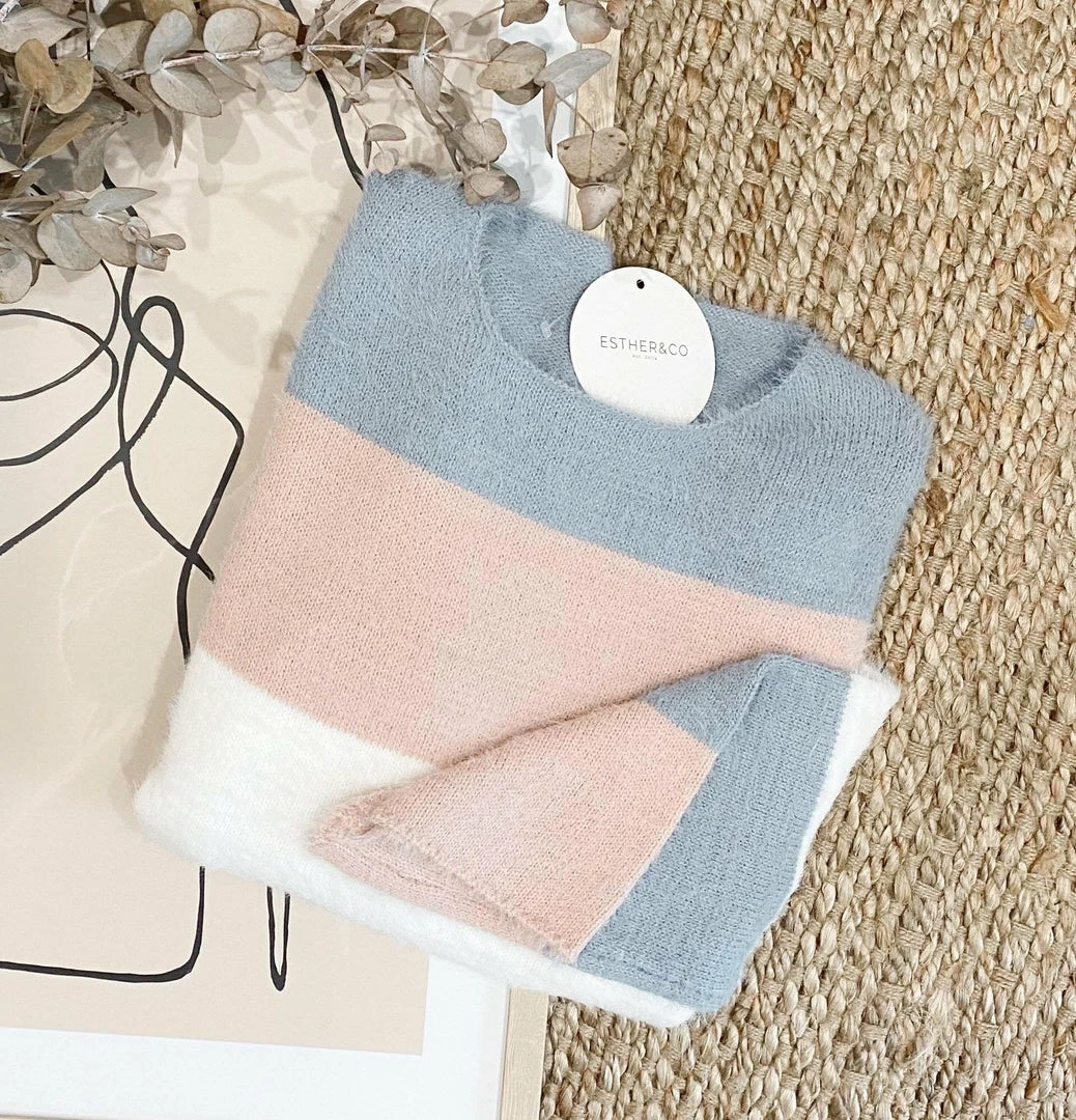 Our Pastella Top is back in a stunning neutral-multi toned knit, colours featured include pastel blue, pink, & ivory block stripe. It’s a lovely medium weight material with raw soft cuffs and hemline. The slight bateau neckline provides a delicate air to the garment making this an elegant edition to the wardrobe. The relaxed long sleeves and fit make this perfect for growing bumps.