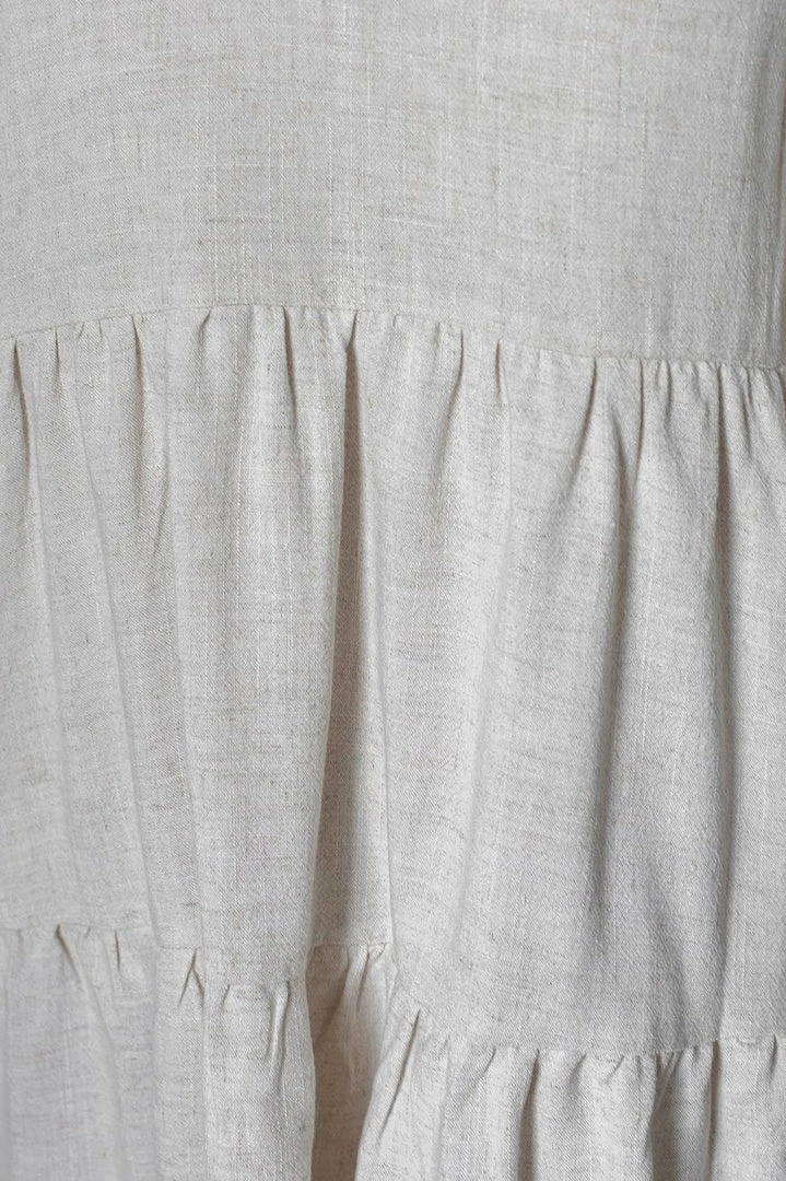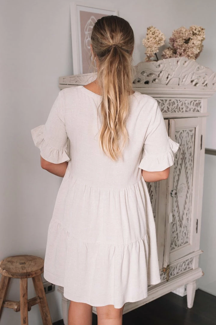 Our Robin Dress comes in a classic beige tone in a relaxed fit. This mini features a V neckline, frill detailing on the sleeves, and tiered skirt. This piece is so easy to throw on for a comfortable and effortless summer’s day look.
