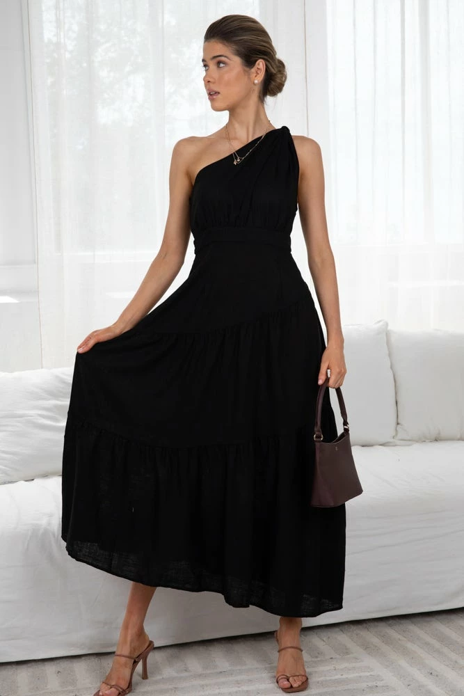 - Key Features: Midi length. One shoulder. Knot detail on sleeve. Gathered fabric on waist. Asymmetric neckline. Tiered skirt.