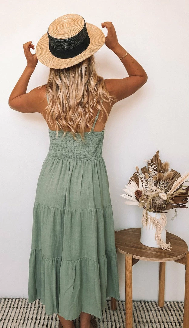 Our Sonya Dress comes in a stunning khaki tone in a relaxed fit. This midi features a V neckline with adjustable spaghetti straps and a comfortable shirred back and flowy tiered skirt. This summer staple is perfect for an effortless and comfortable summer look.
